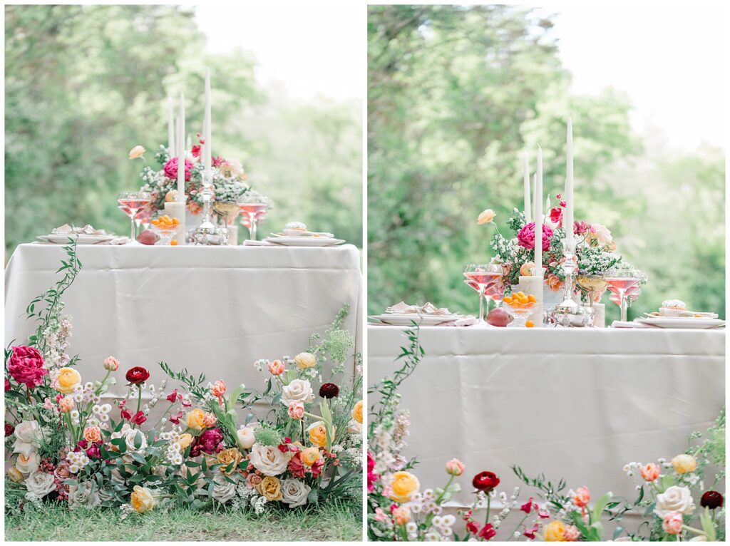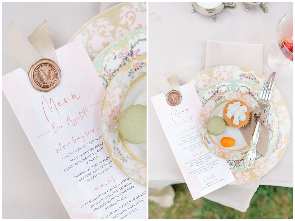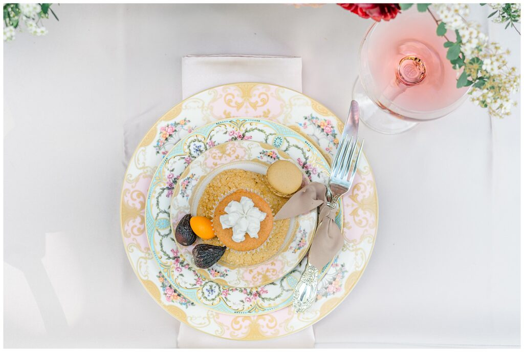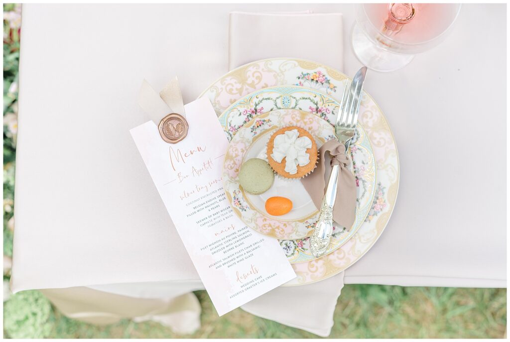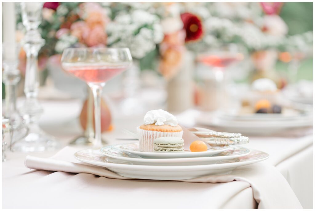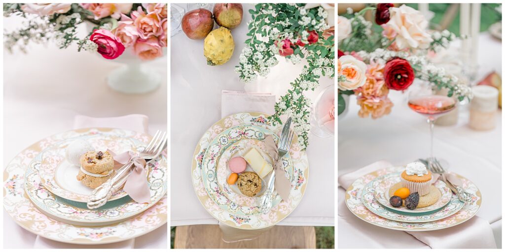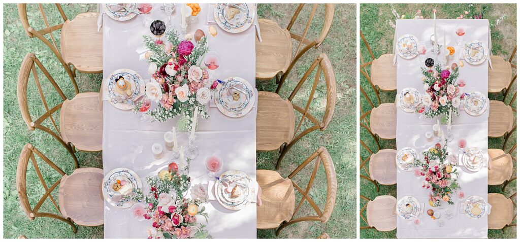 Our first stop was the secluded elopement reception area tucked away near the back of the property. The table setup was absolutely stunning, featuring blush pink linens, delicate floral arrangements, and beautifully styled menus and place cards. Desserts were perfectly arranged on the table! I even managed to capture an aerial view of the head table — yes, photographers will do anything for the perfect shot!