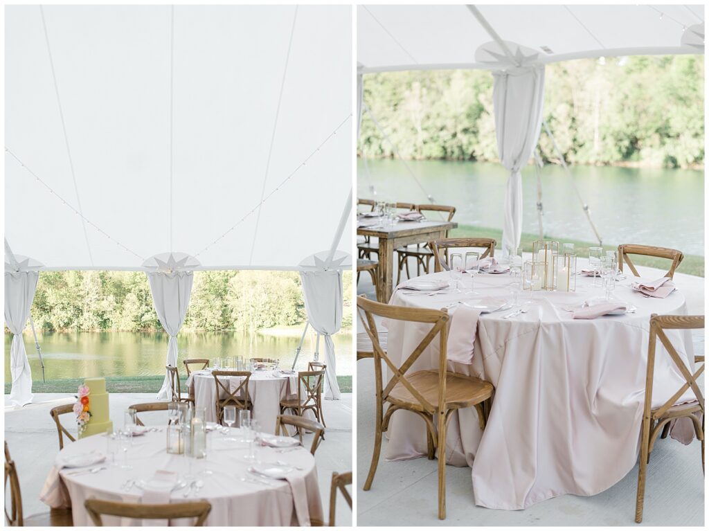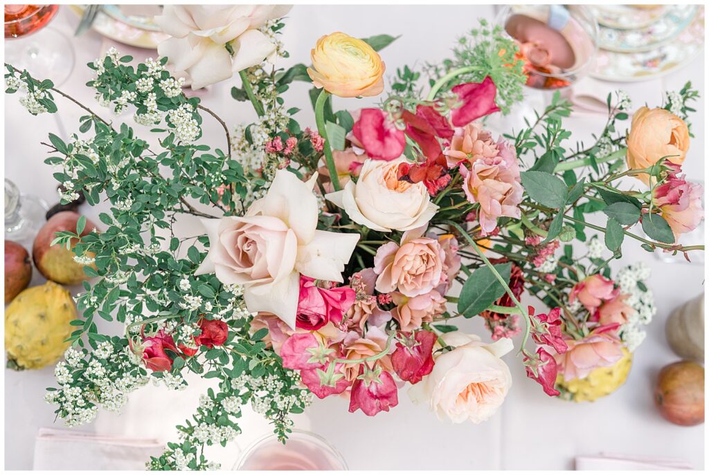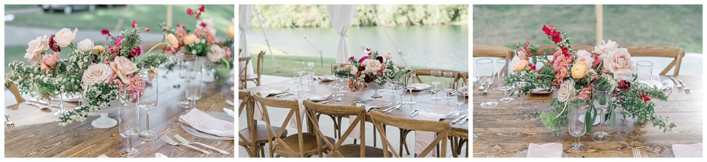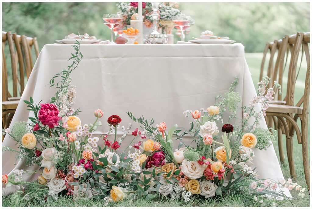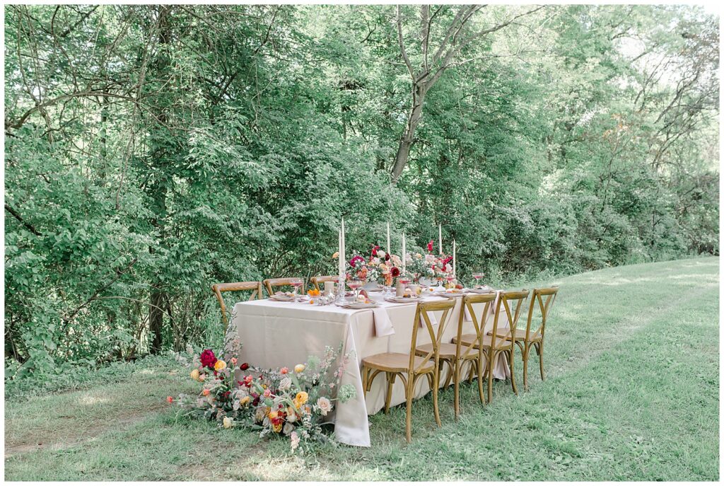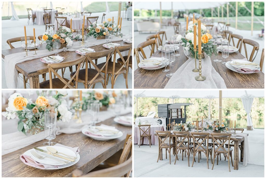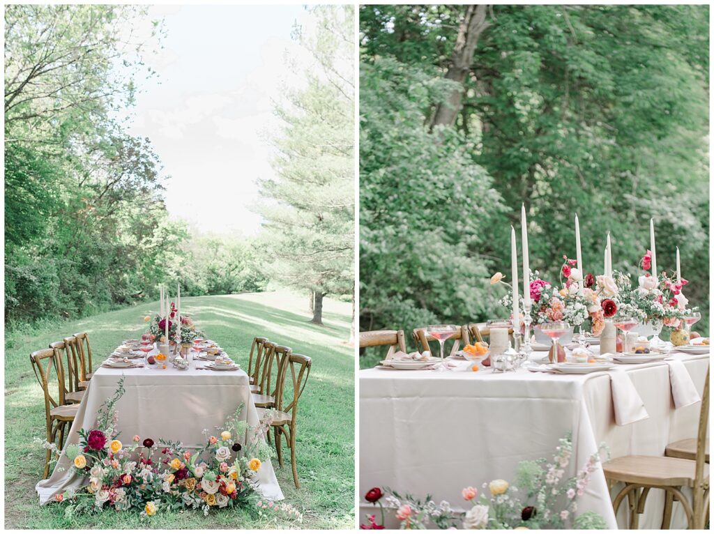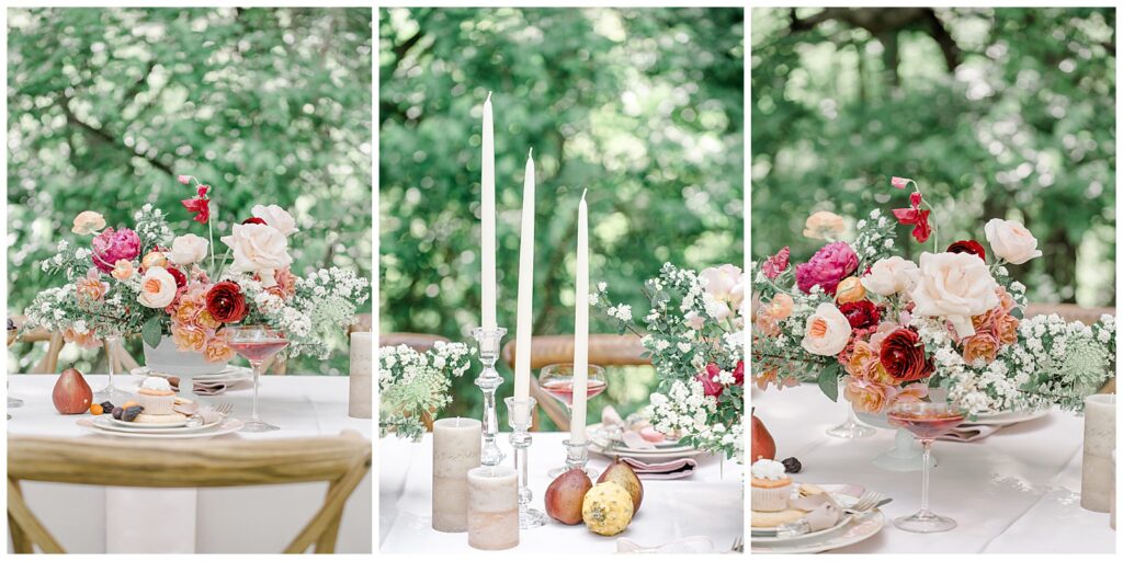 Our first stop was the secluded elopement reception area tucked away near the back of the property. The table setup was absolutely stunning, featuring blush pink linens, delicate floral arrangements, and beautifully styled menus and place cards. Desserts were perfectly arranged on the table! I even managed to capture an aerial view of the head table — yes, photographers will do anything for the perfect shot!