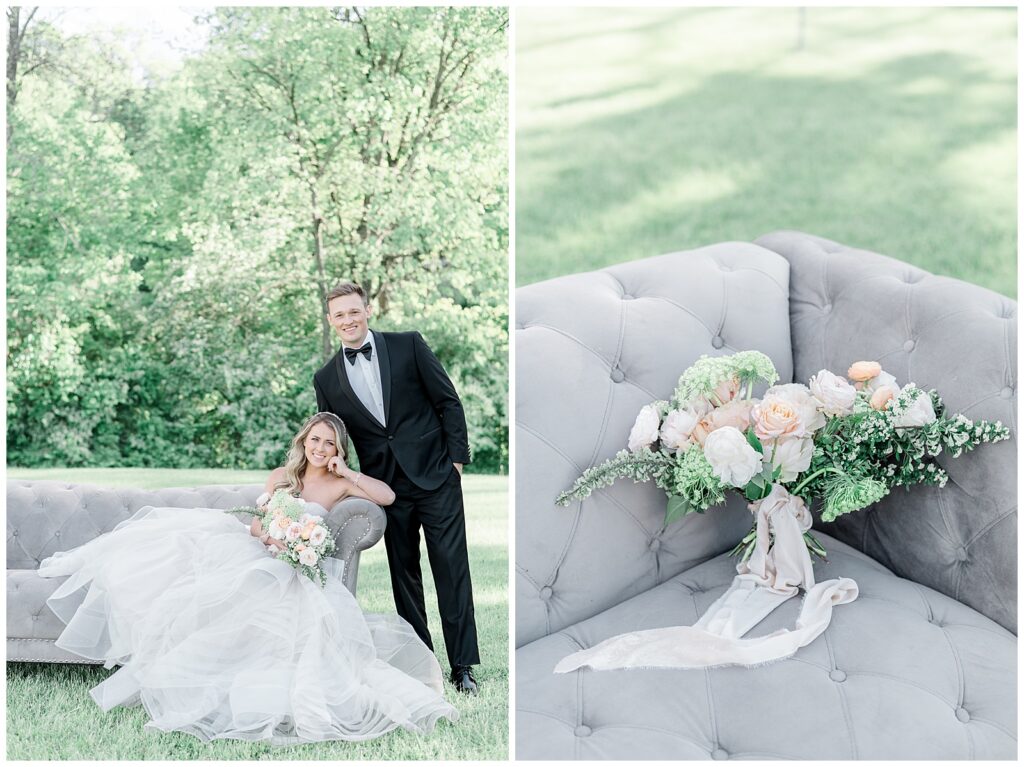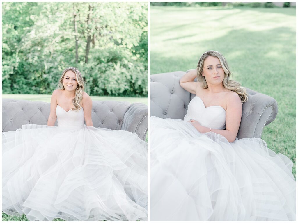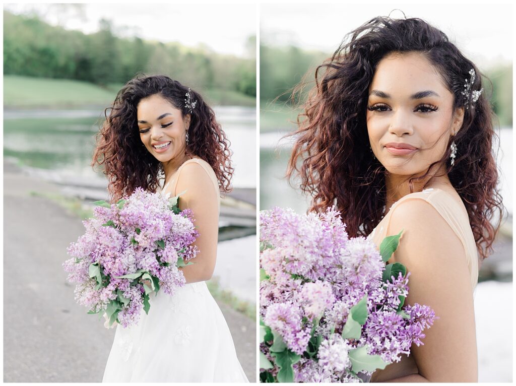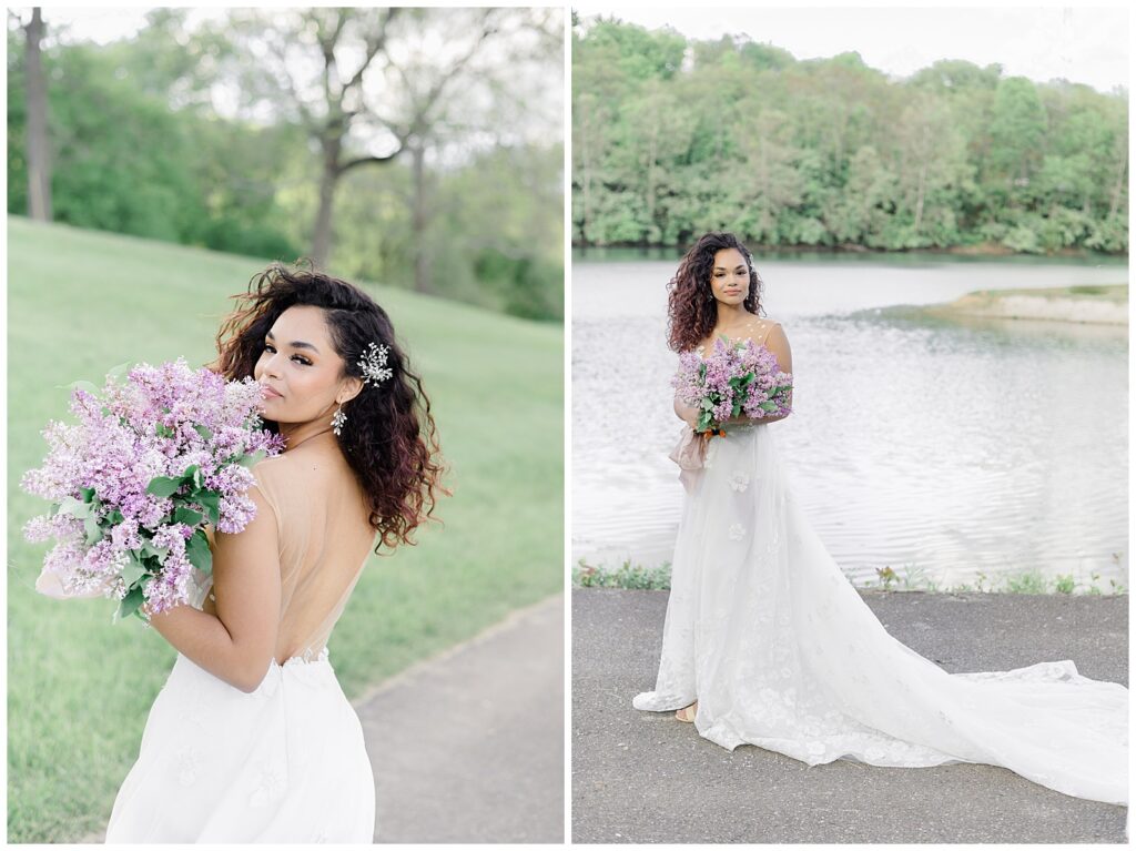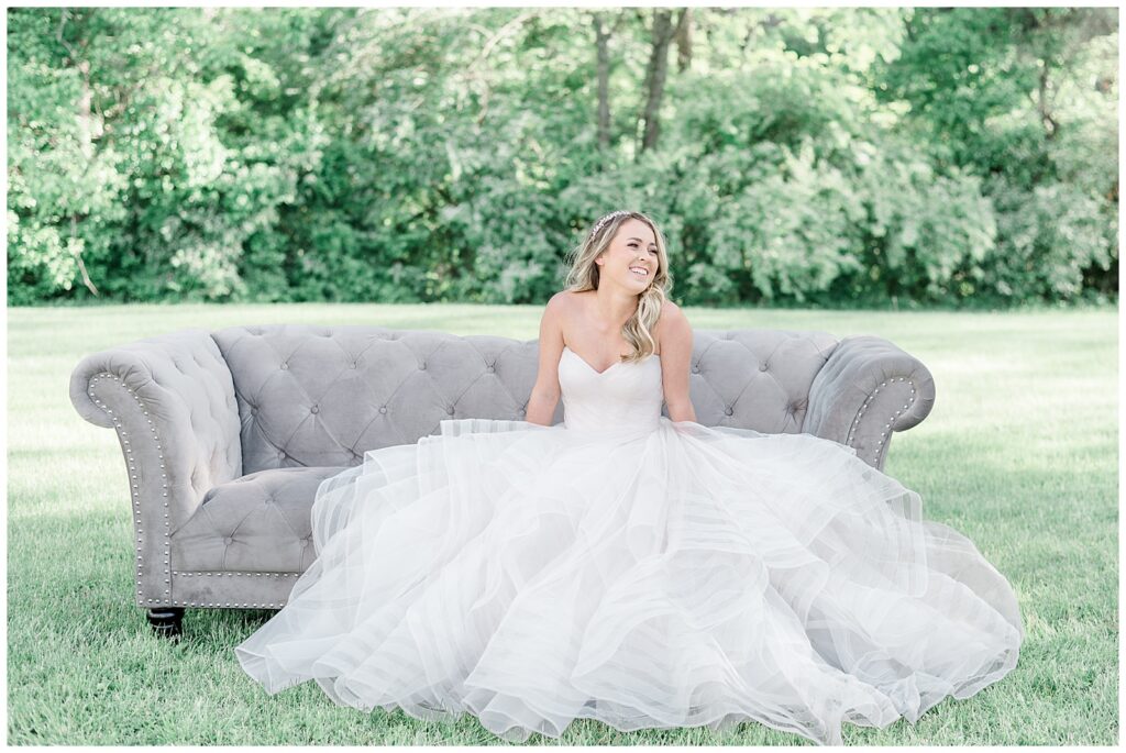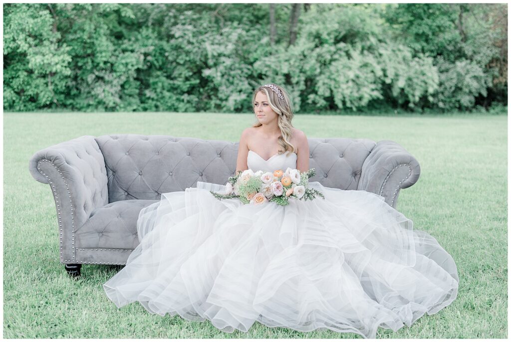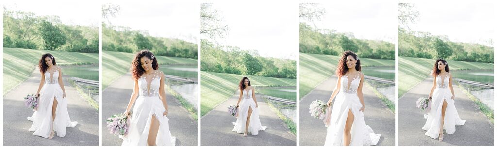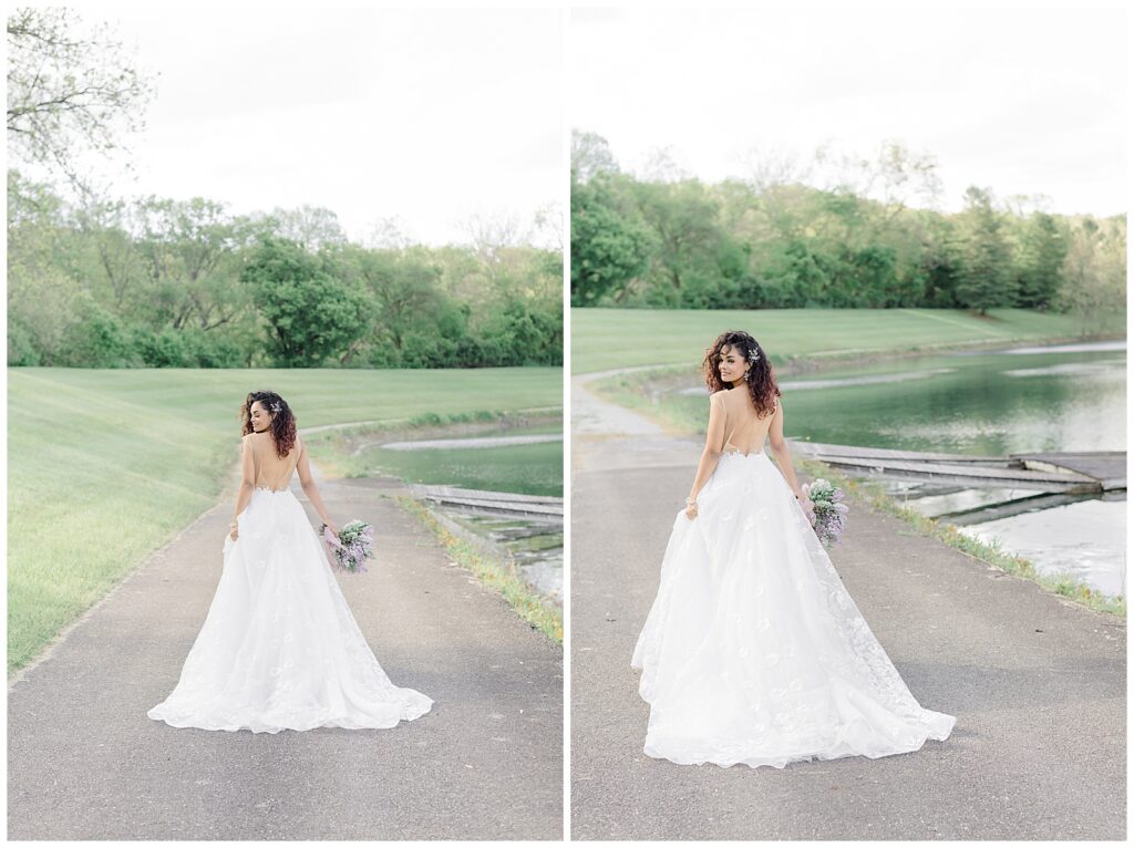 Next, we captured a stunning solo bride along the pathway next to the pond. Her gown and lilac florals complemented the natural surroundings beautifully. We then moved to the reception tent to photograph the bride with a playful lounge setup — complete with an adorable puppy — creating whimsical and timeless portraits.