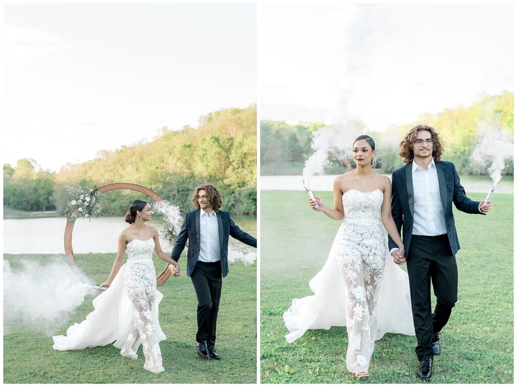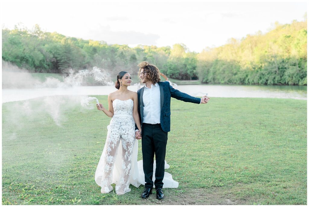 The session ended with a playful twist: smoke bombs! The bride wore a lace jumpsuit, making for a fun, whimsical, and memorable finale.