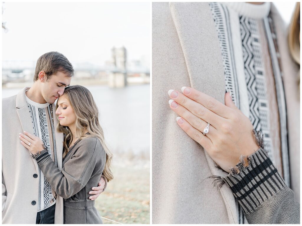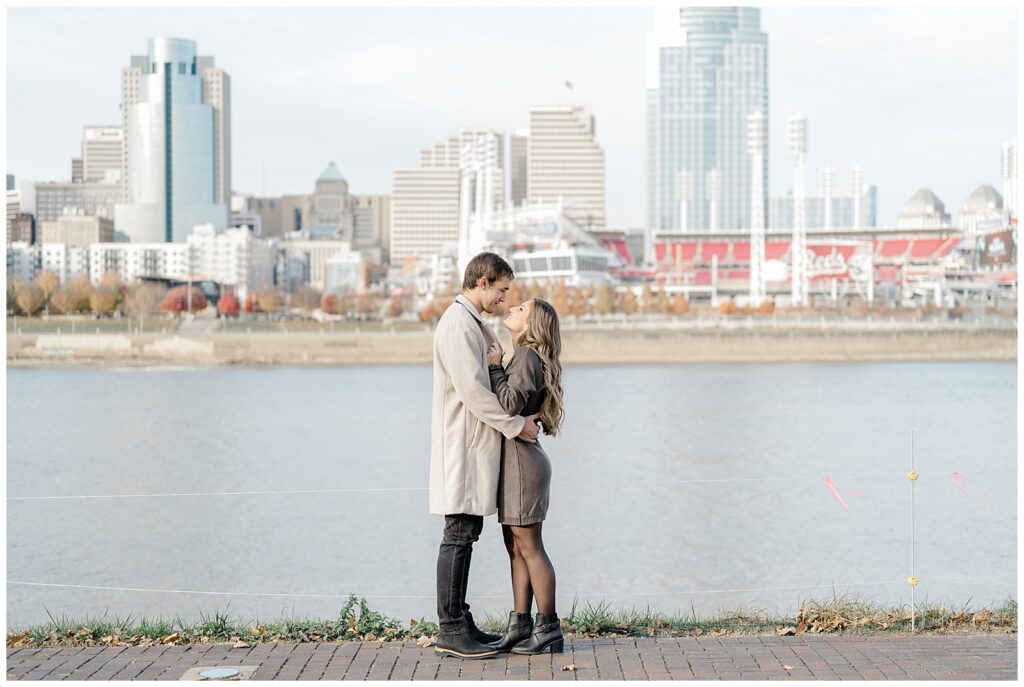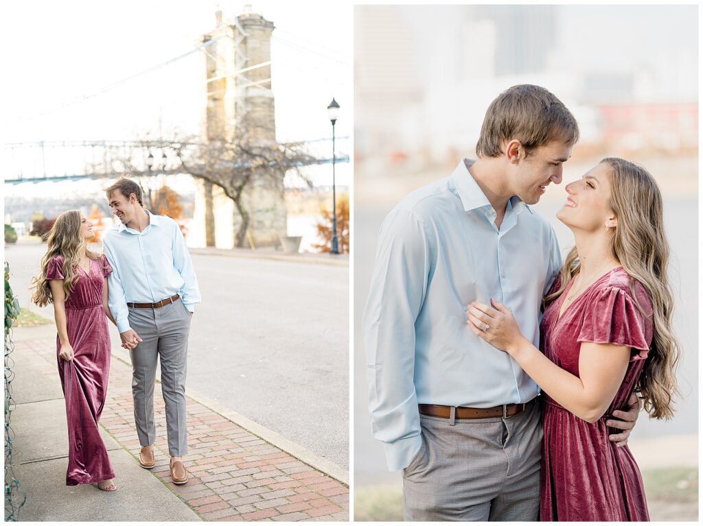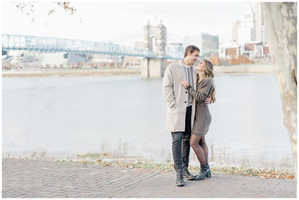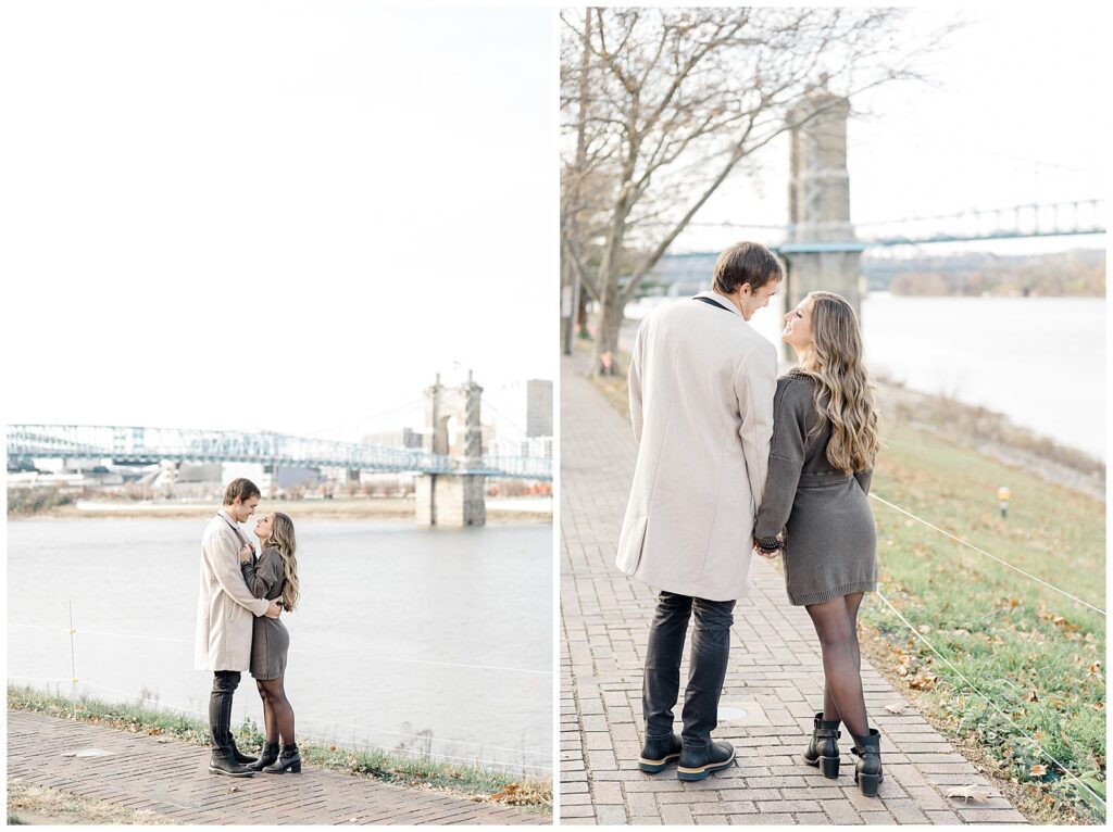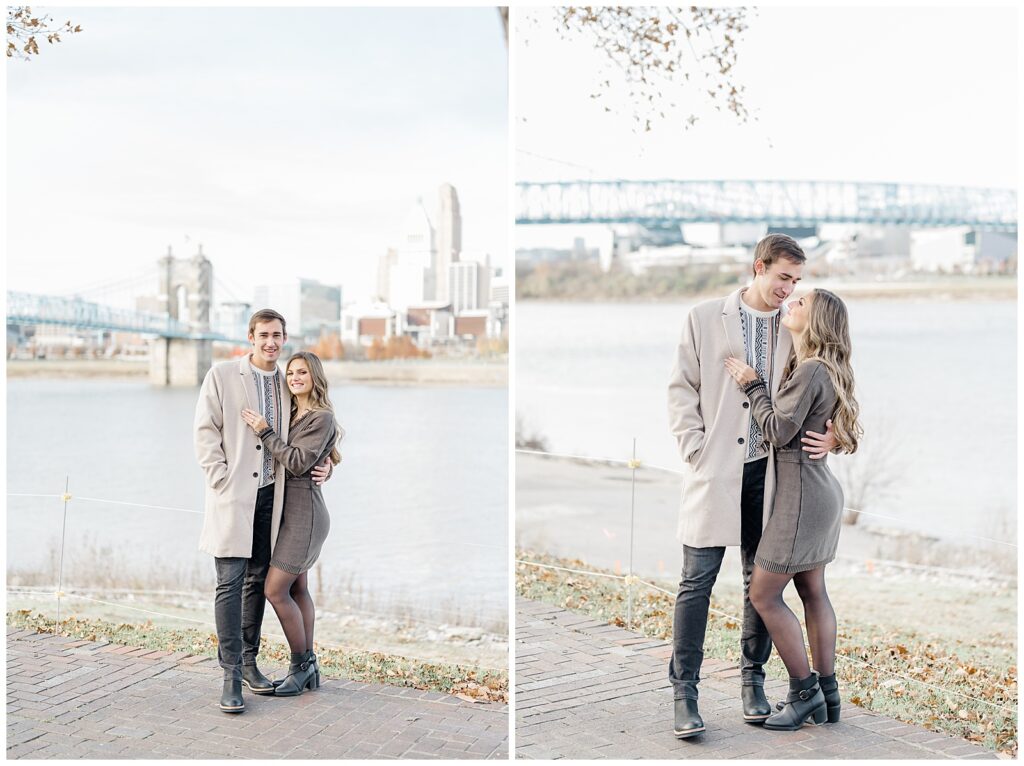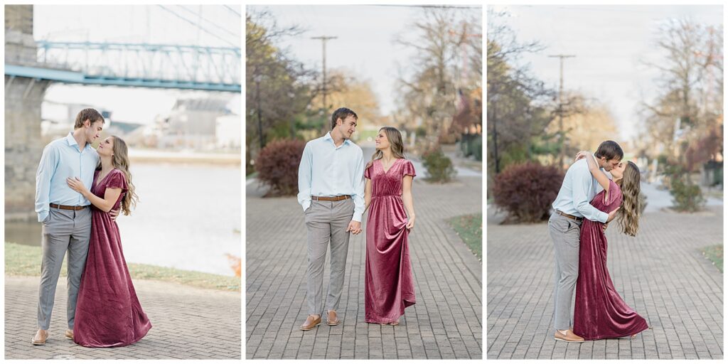 This November engagement session with Ashlynn and Wes at George Rogers Clark Park in Covington, Ohio was such a joy to capture. This intimate park is one of my favorite hidden gems! It’s small but full of variety, featuring a charming brick pathway, river views, the Roebling Bridge, and even the Cincinnati skyline in the distance.