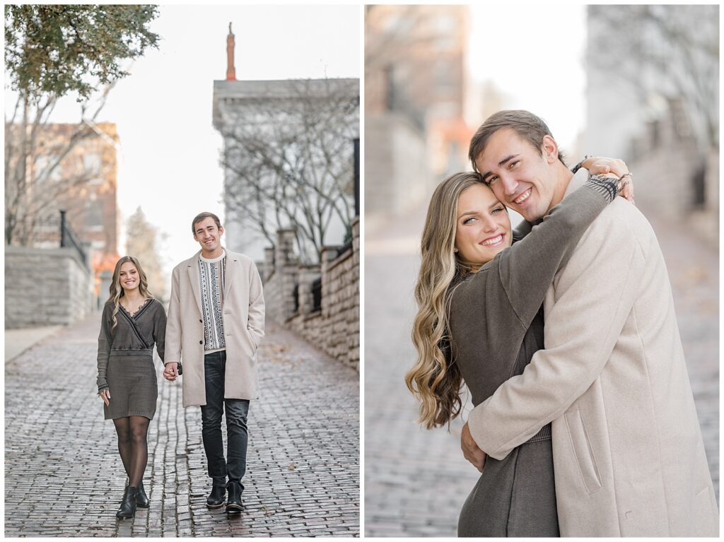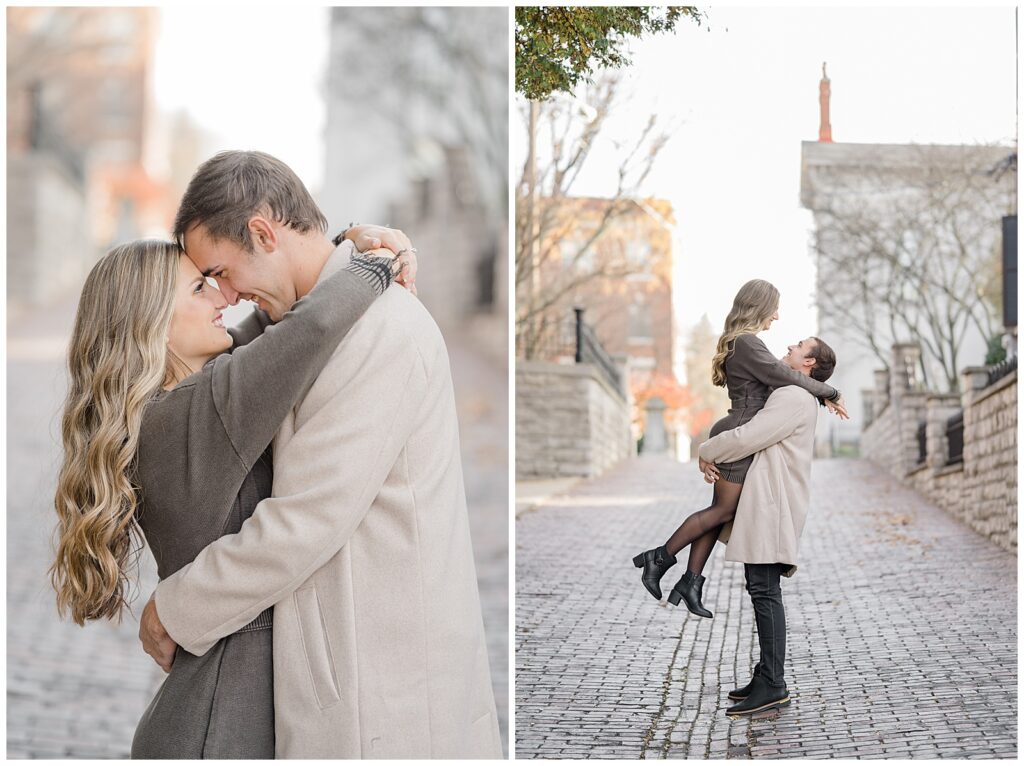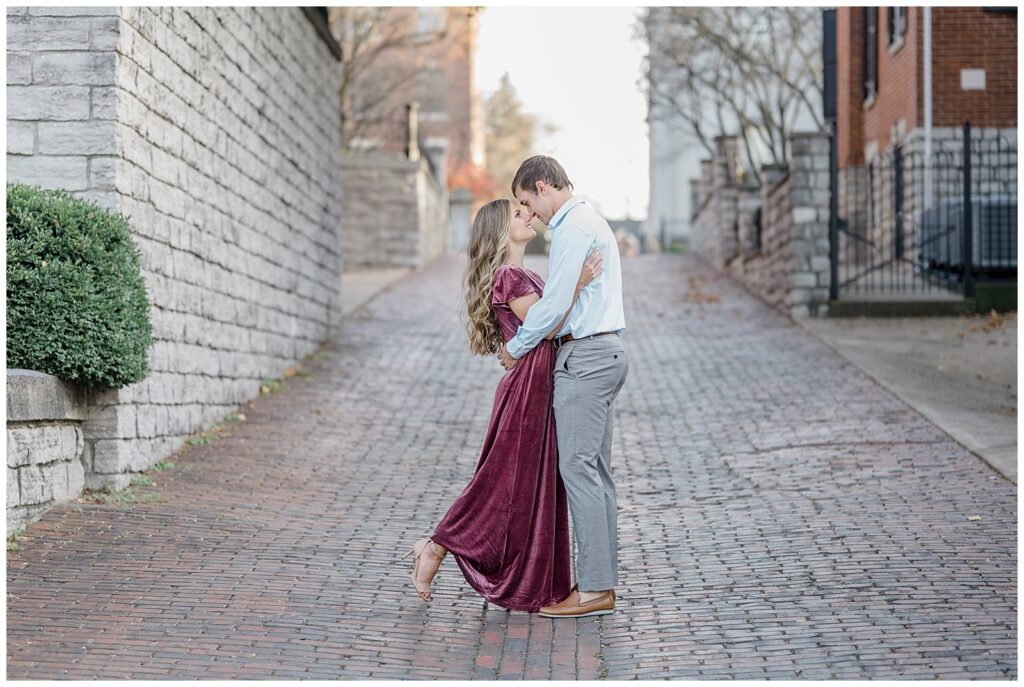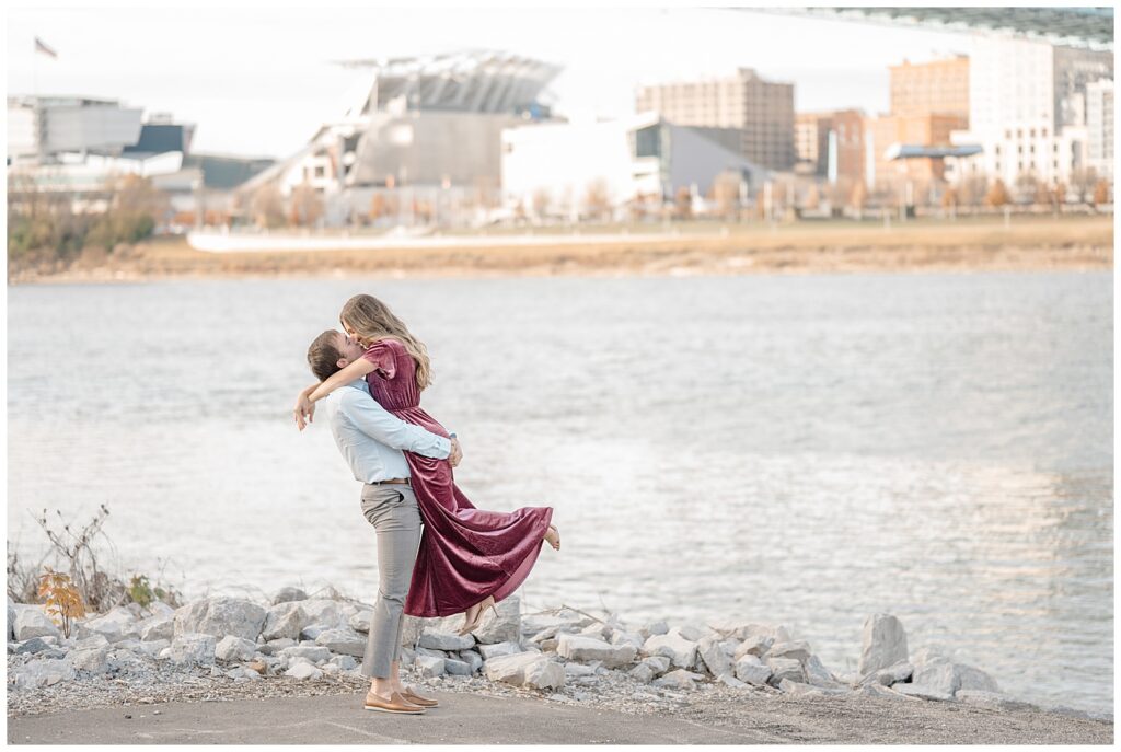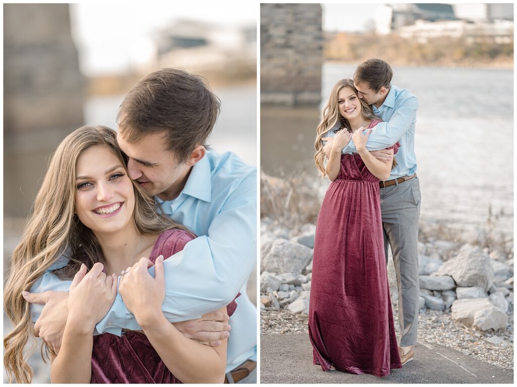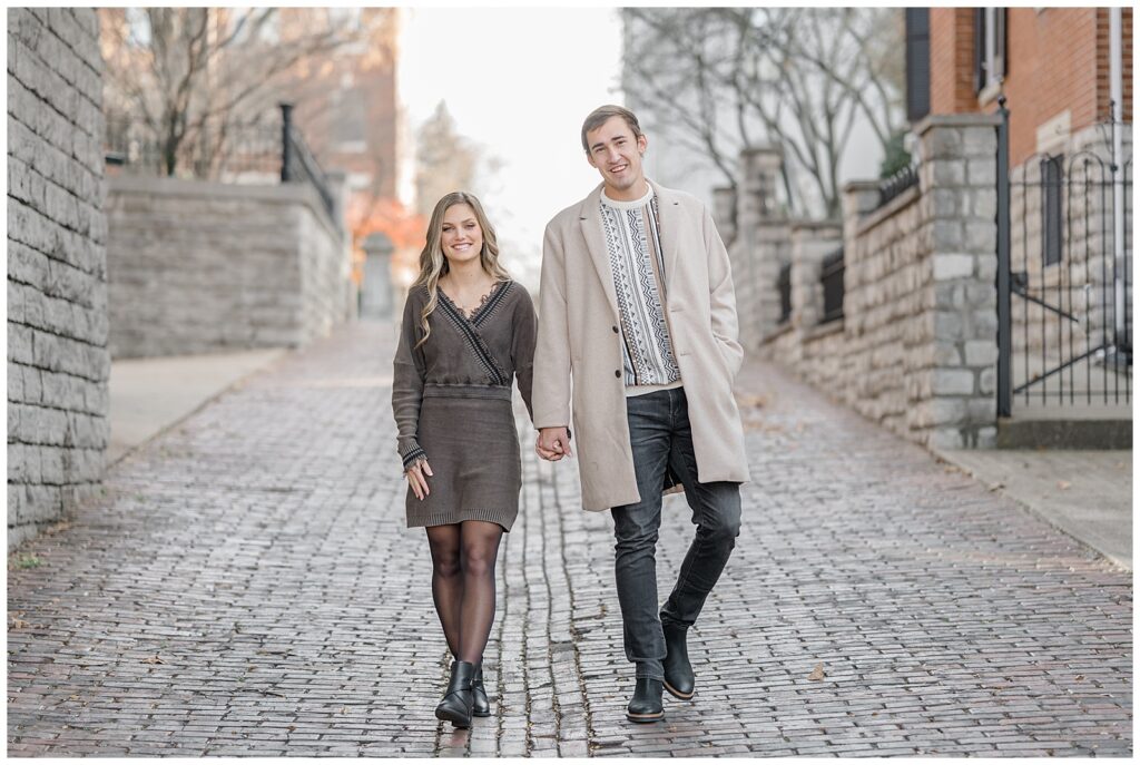 This November engagement session with Ashlynn and Wes at George Rogers Clark Park in Covington, Ohio was such a joy to capture. This intimate park is one of my favorite hidden gems! It’s small but full of variety, featuring a charming brick pathway, river views, the Roebling Bridge, and even the Cincinnati skyline in the distance.