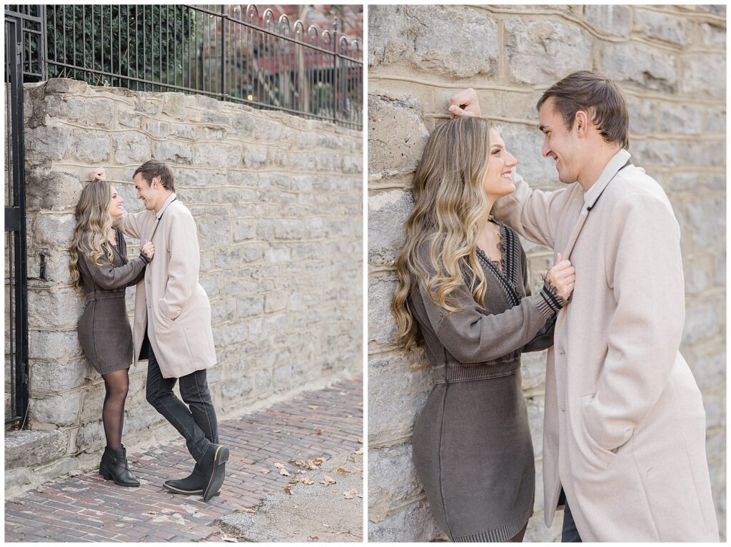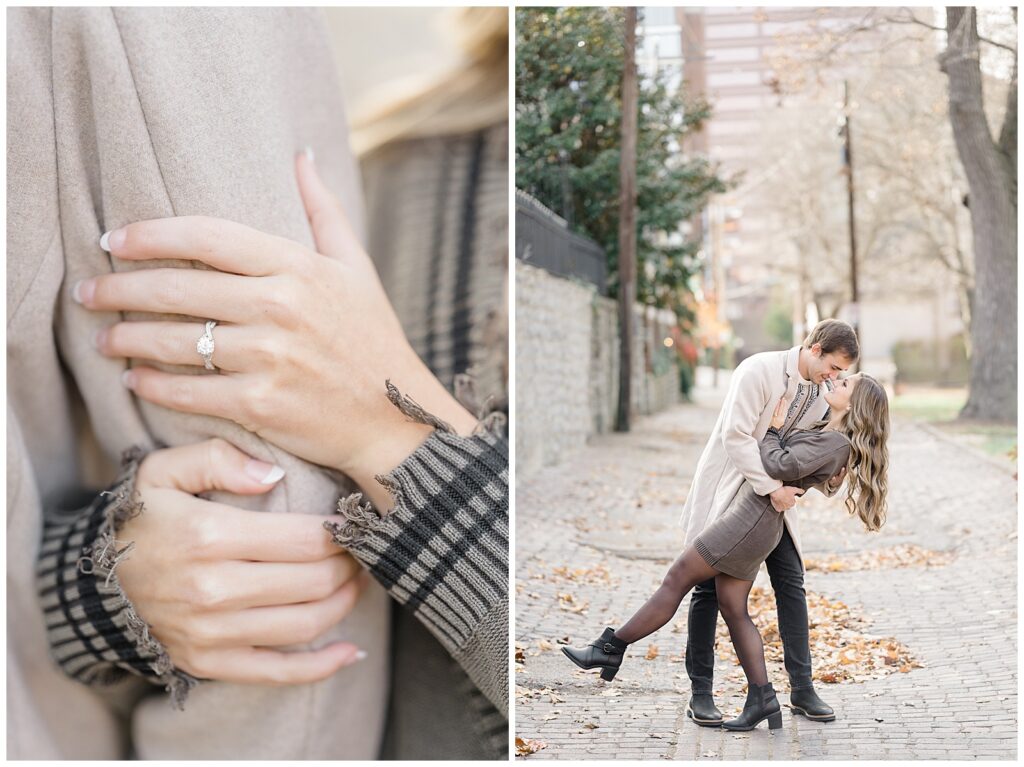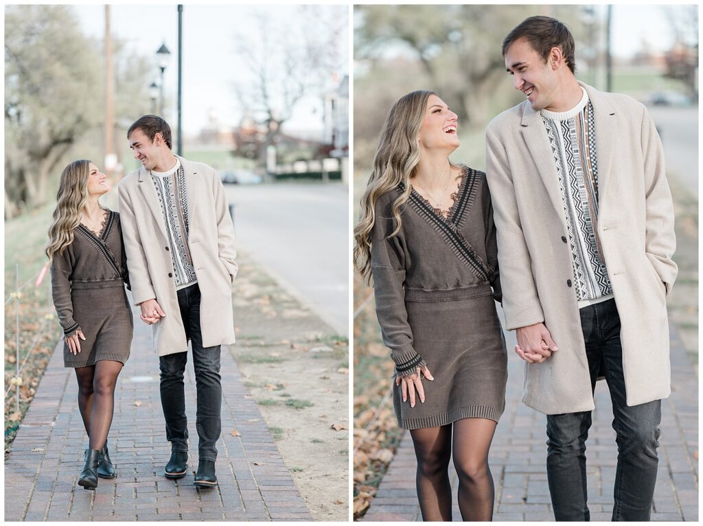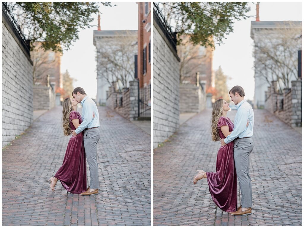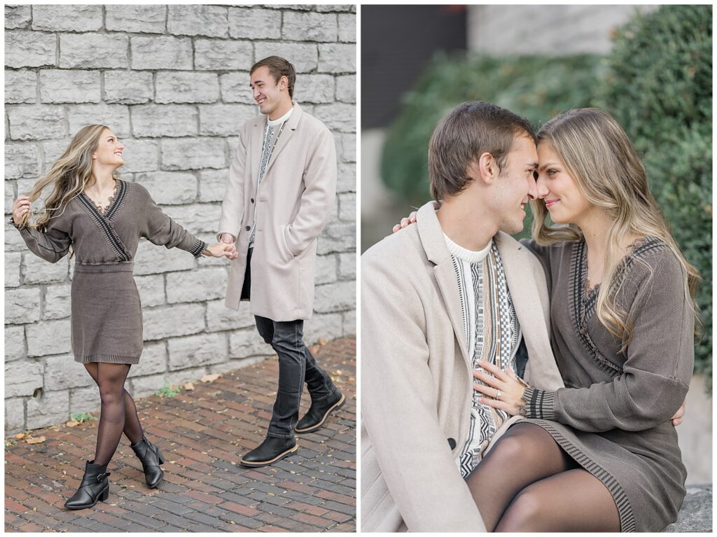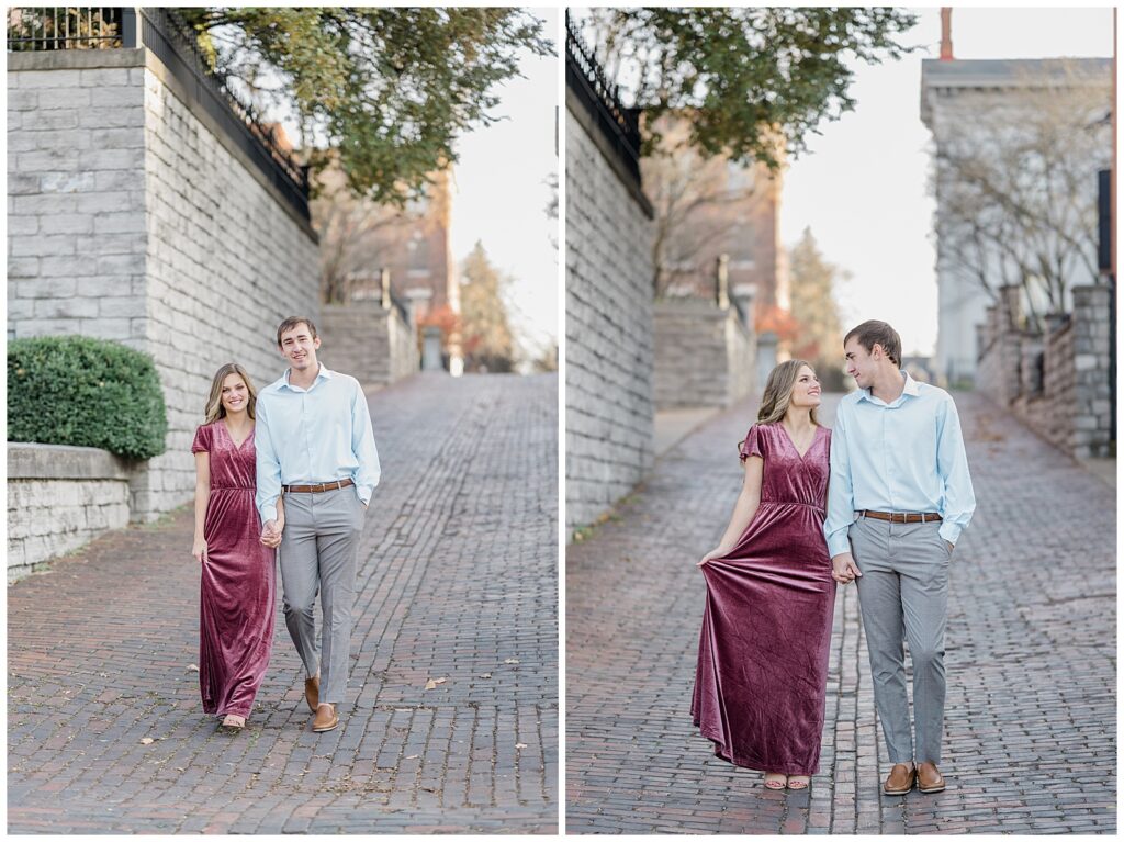 This November engagement session with Ashlynn and Wes at George Rogers Clark Park in Covington, Ohio was such a joy to capture. This intimate park is one of my favorite hidden gems! It’s small but full of variety, featuring a charming brick pathway, river views, the Roebling Bridge, and even the Cincinnati skyline in the distance.