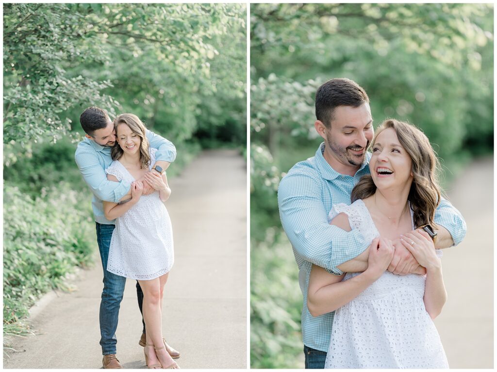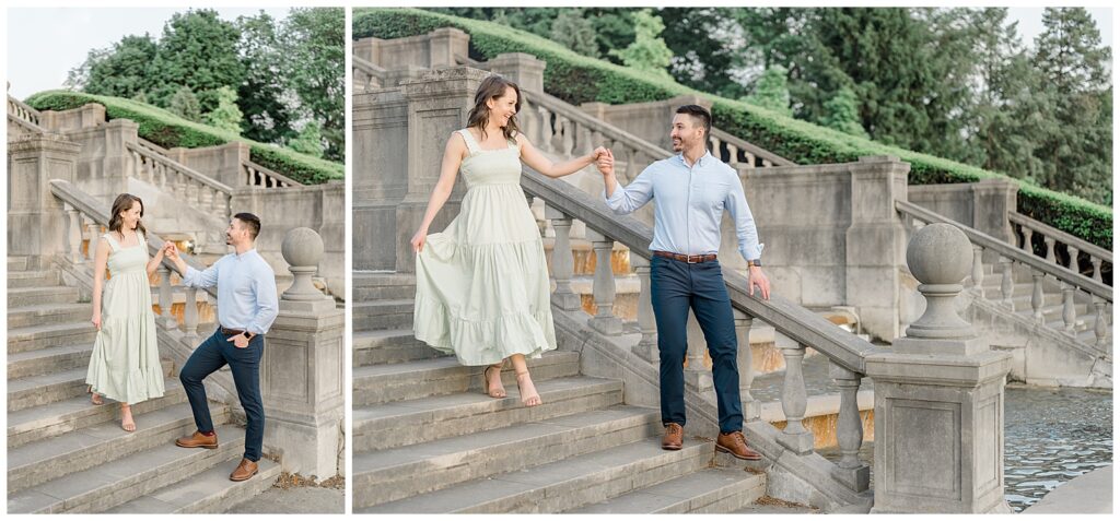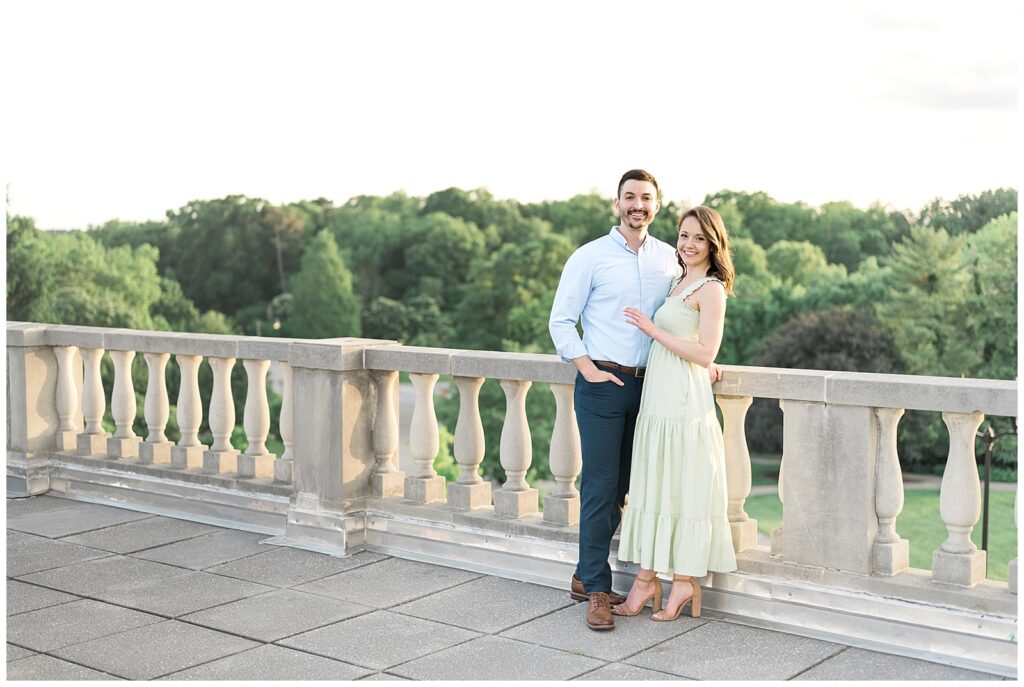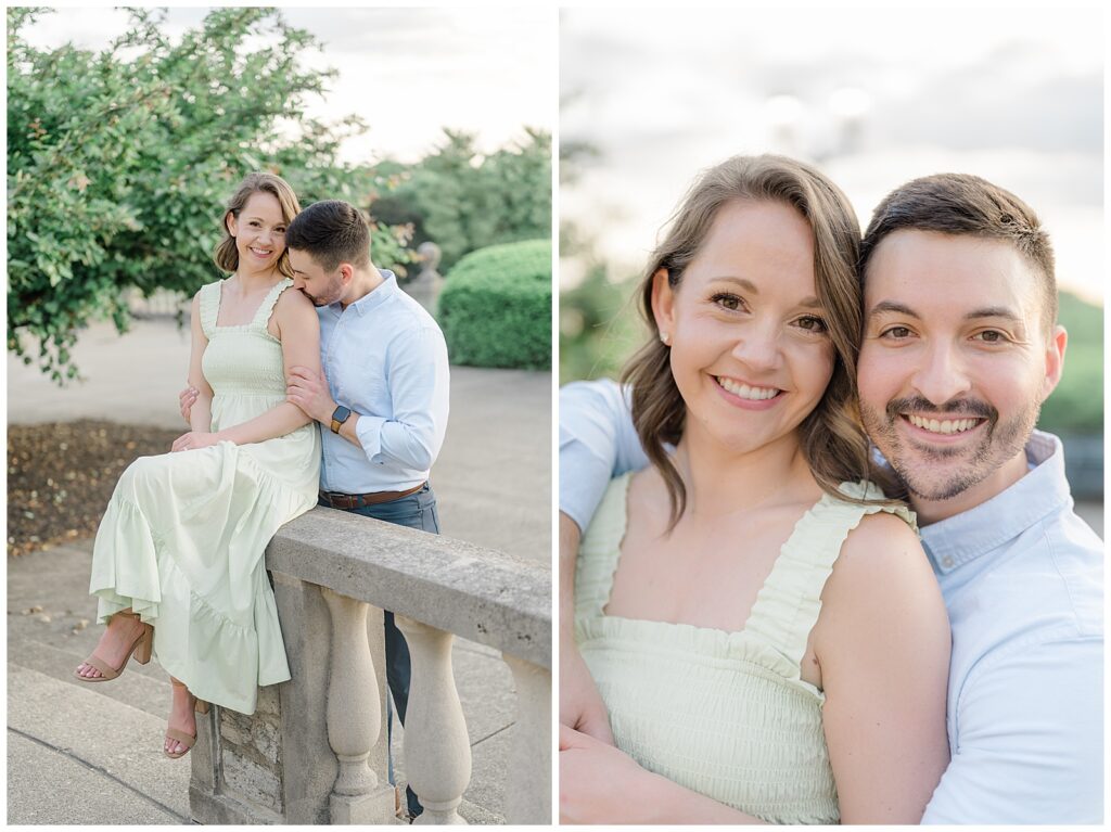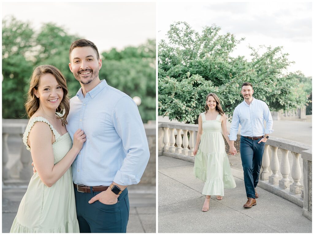 For their first outfit, Mollie wore the cutest short white dress, and I have to say… I love it when my brides choose white for their engagement sessions. There’s something so special about it — like they’re already stepping into that bridal season, and it photographs beautifully. Ben looked incredibly handsome in his blue outfit, which paired perfectly with the greenery and classic architecture of Ault Park.