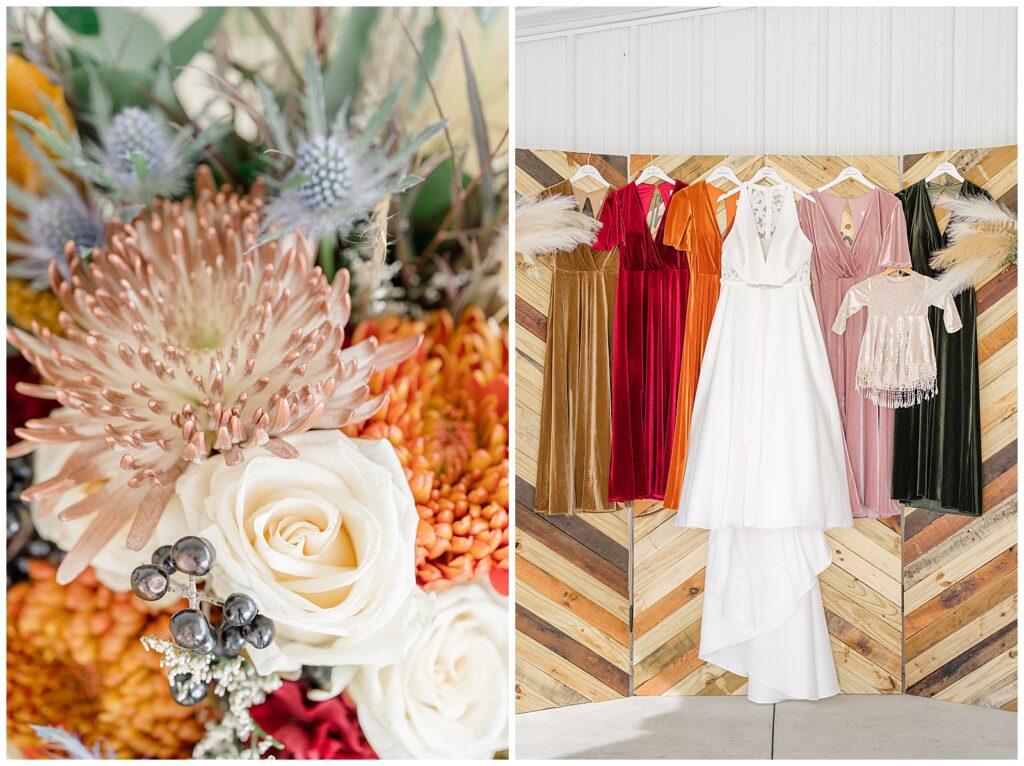 The bridal party’s color palette was absolute perfection. Each bridesmaid wore a different velvet dress in rich jewel tones—emerald, terracotta, ruby, mauve, and caramel/mustard. Together with the florals, the colors felt warm, romantic, and incredibly cohesive.
