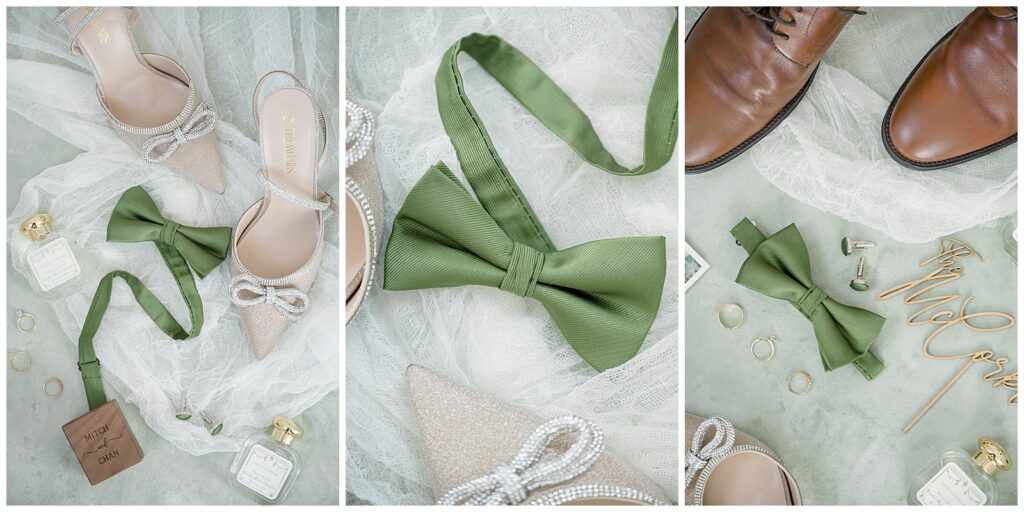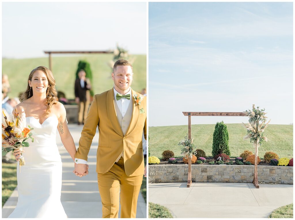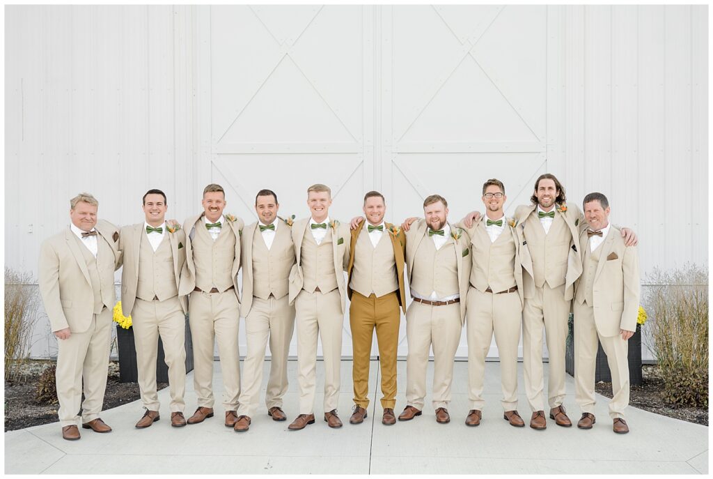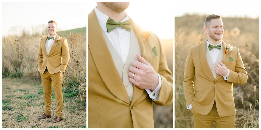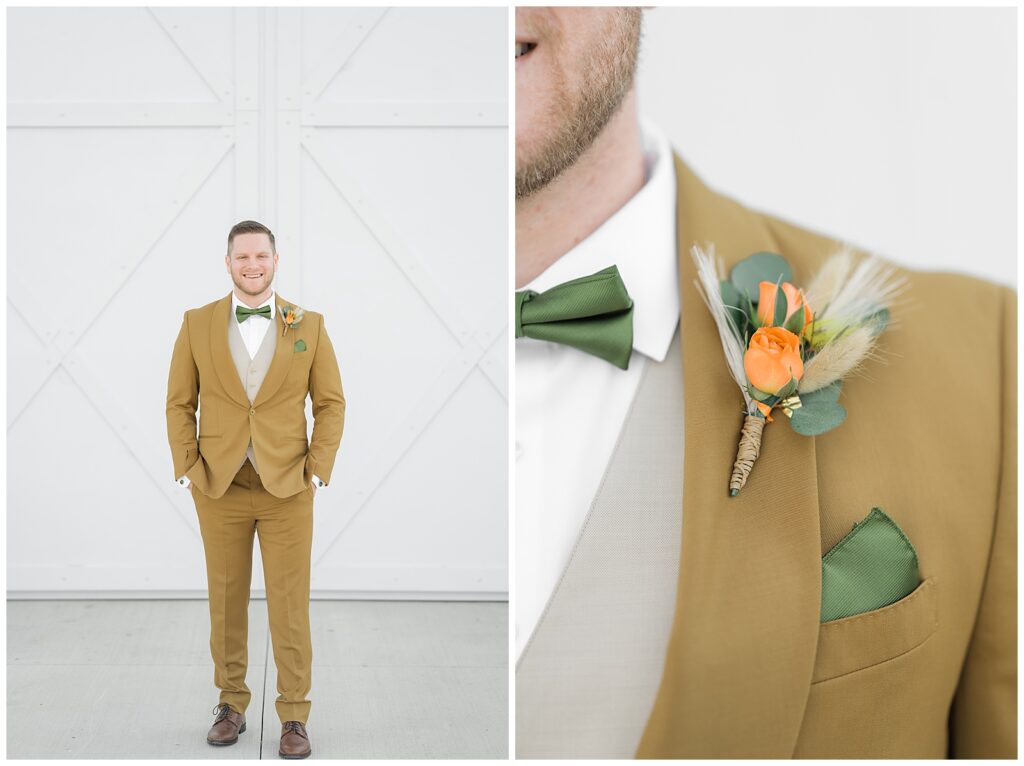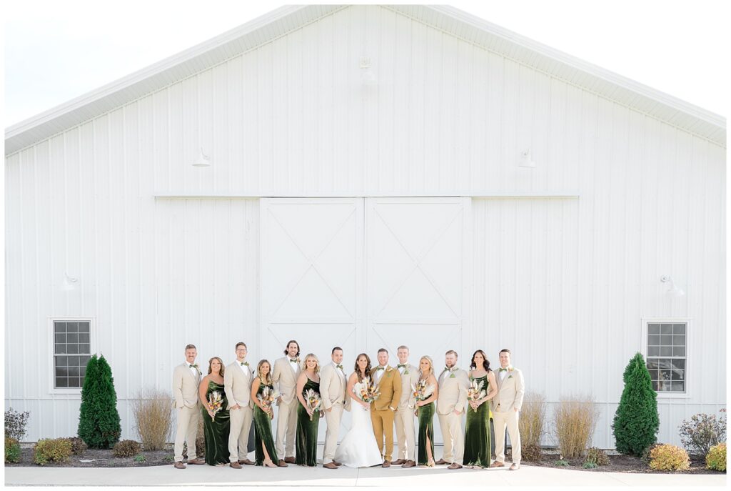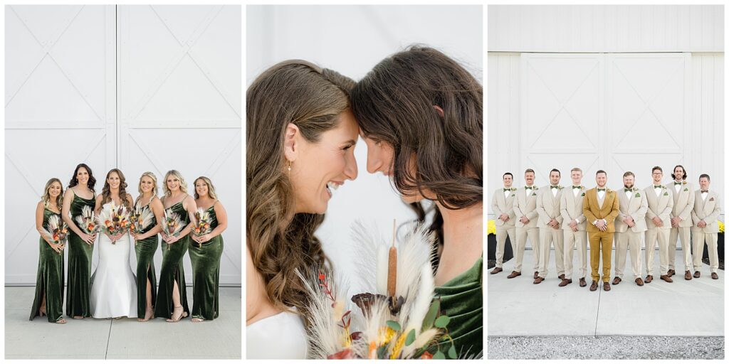 Mitchell’s mustard suit was a bold and perfect choice for fall, instantly standing out while still feeling cohesive with the season. The groomsmen wore light khaki suits, which balanced everything beautifully and highlighted the groom even more. The bridesmaids wore stunning green velvet dresses that paired perfectly with the florals and overall aesthetic.