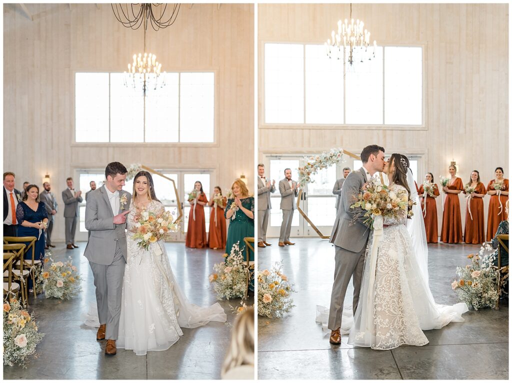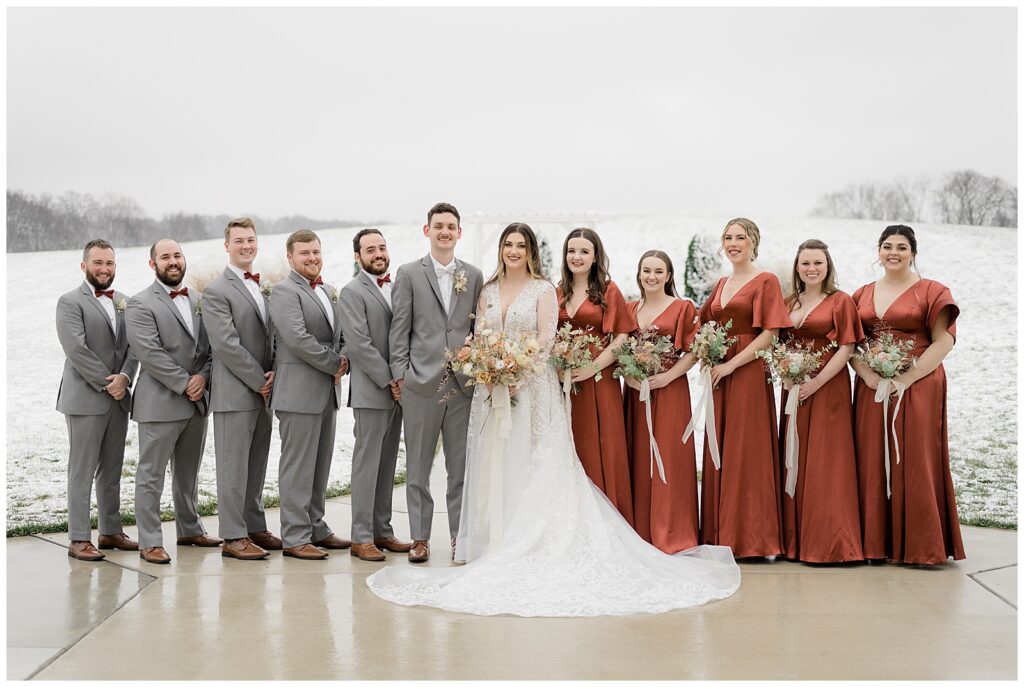 The bridesmaids wore warm terracotta dresses, the men wore gray suits, and the entire palette felt cozy and romantic against the winter landscape. Robin’s dress—with long lace sleeves and a flowing train—was absolutely stunning.