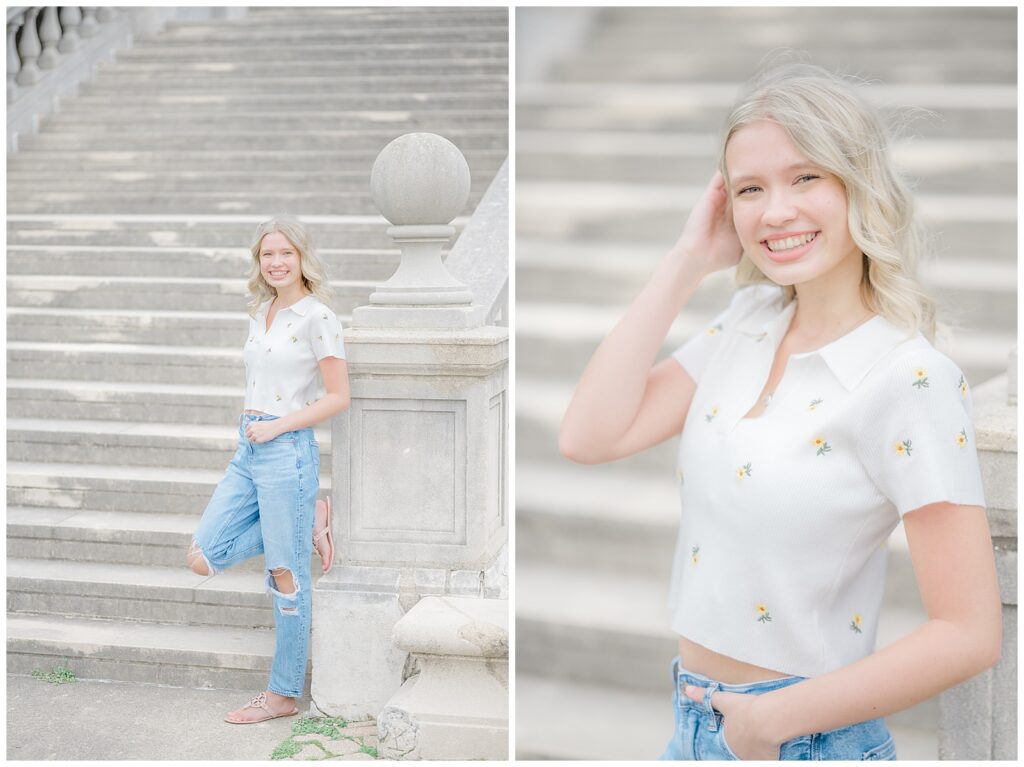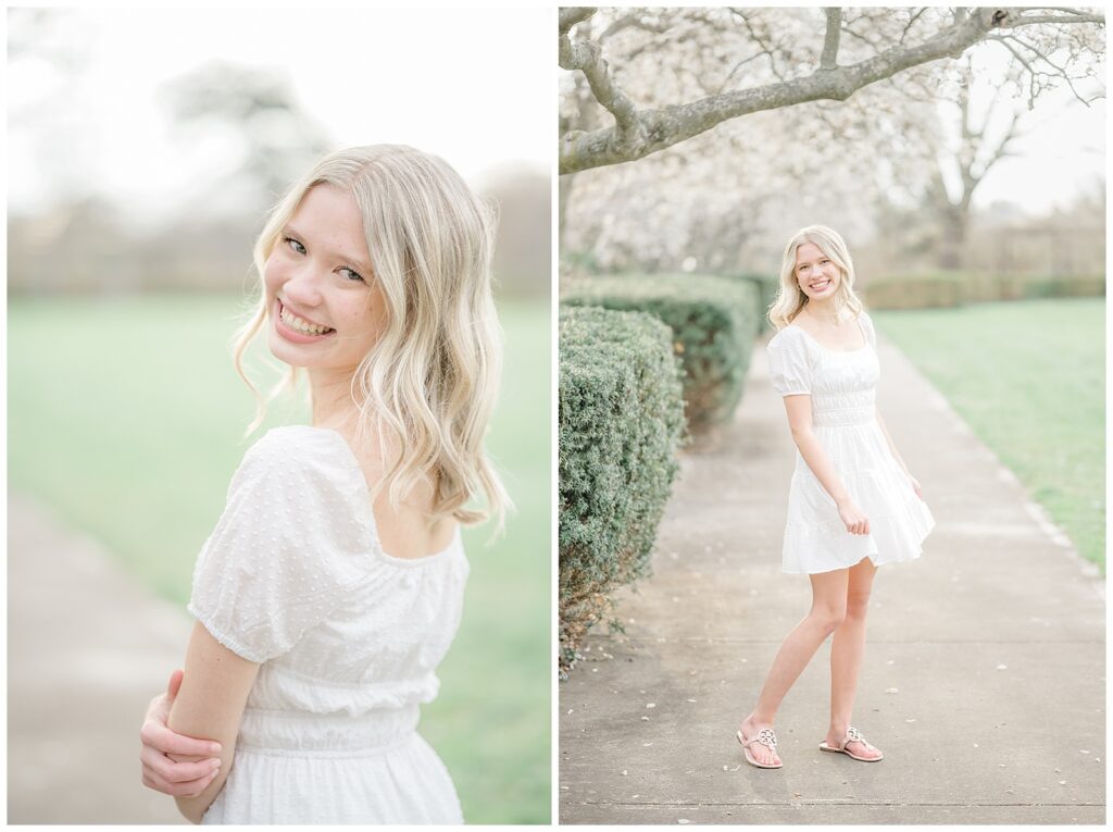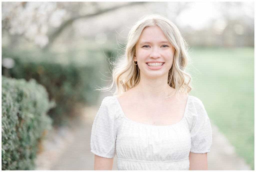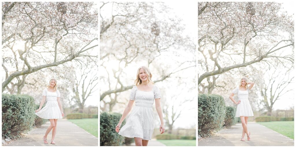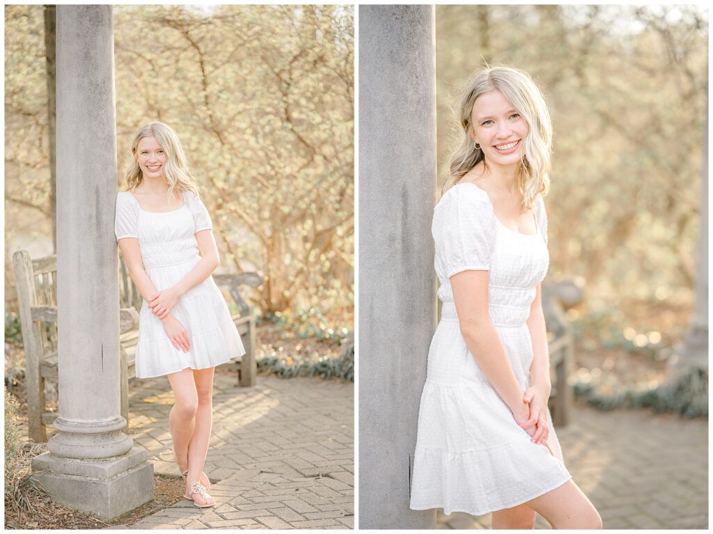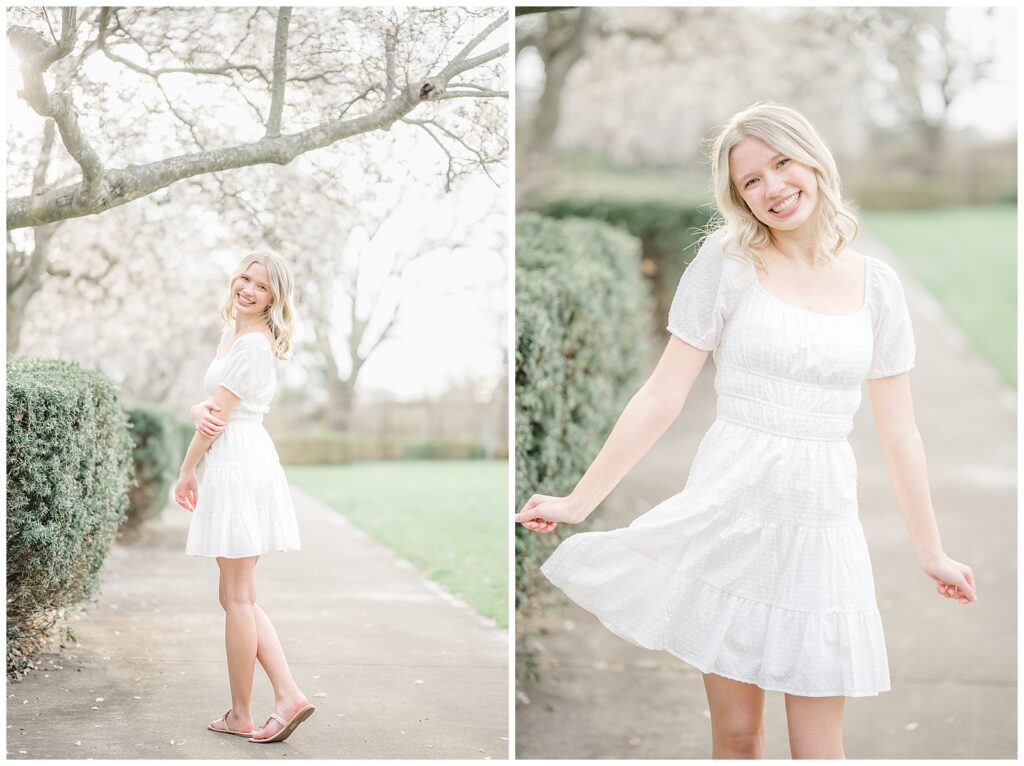 We started the session in a casual outfit on the steps and pavilion area, taking advantage of the early-season access before the wedding tents go up. Grace then changed into the cutest white dress, which paired beautifully with the blooming florals around the park.