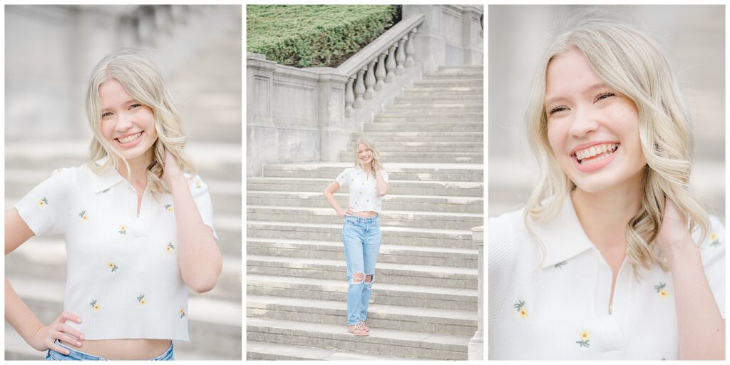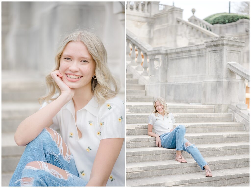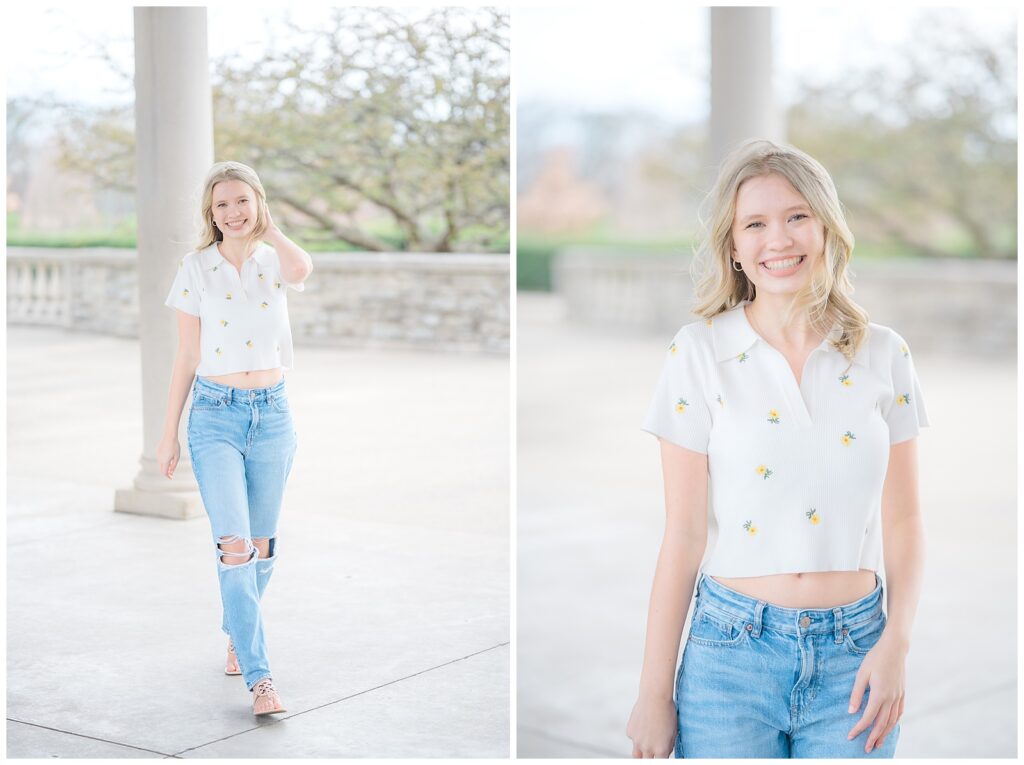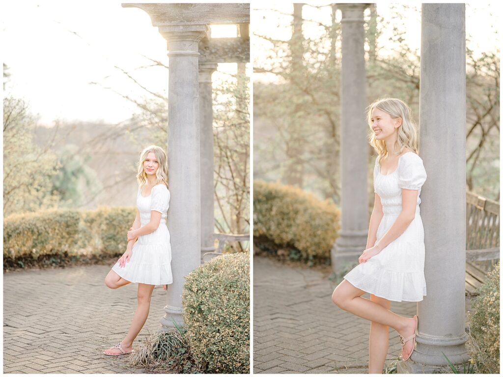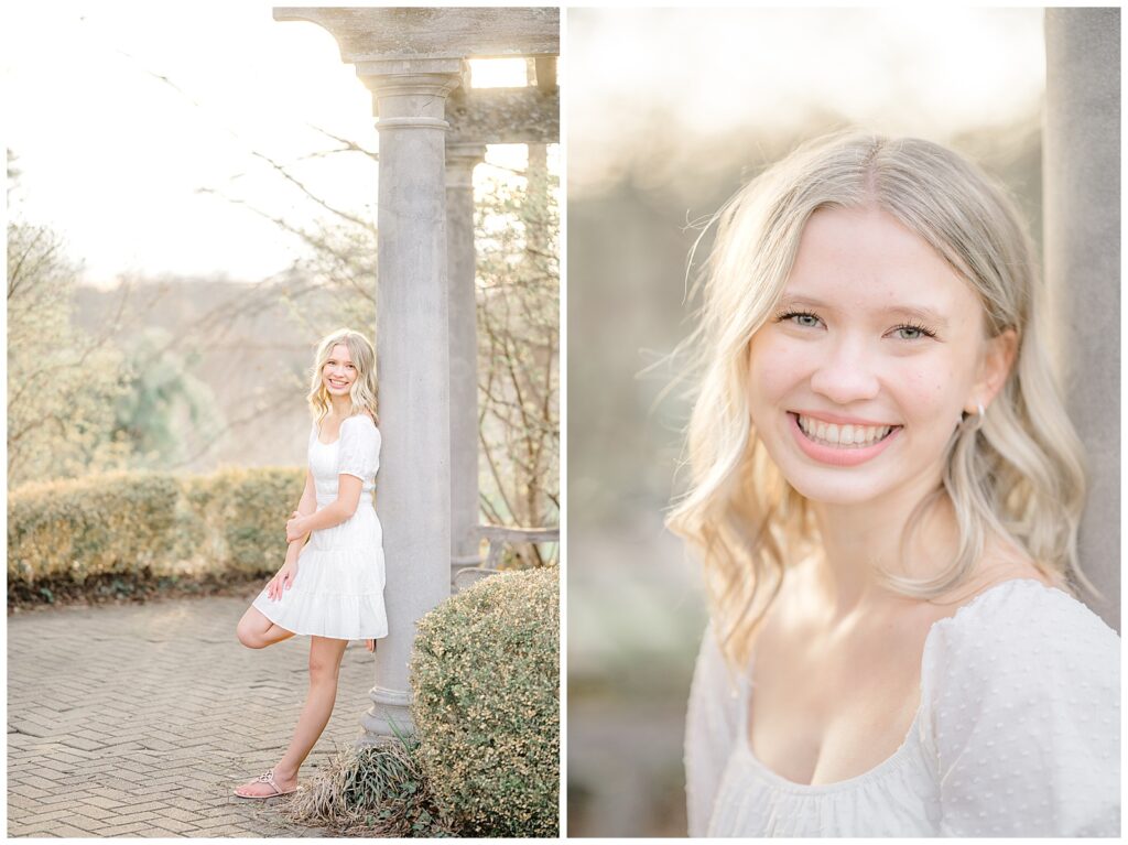 We started the session in a casual outfit on the steps and pavilion area, taking advantage of the early-season access before the wedding tents go up. Grace then changed into the cutest white dress, which paired beautifully with the blooming florals around the park.