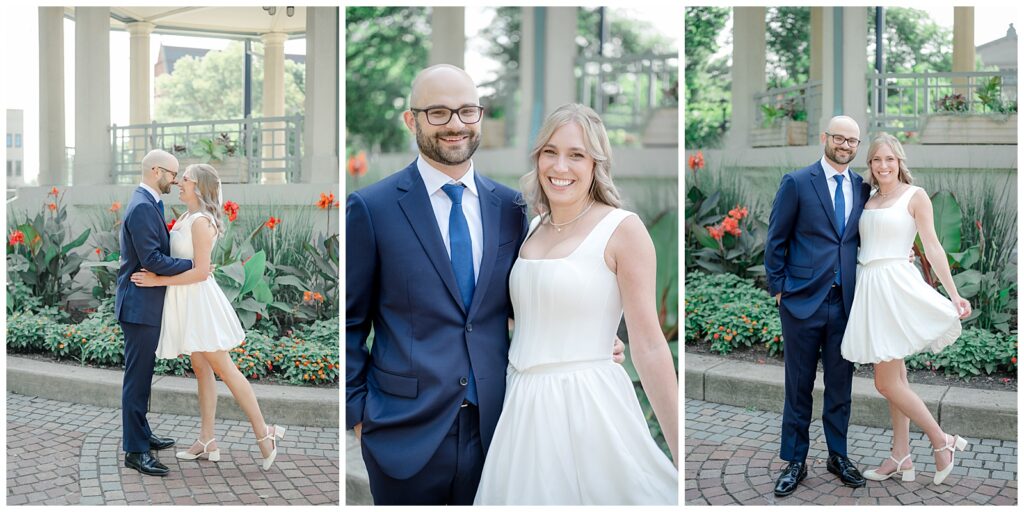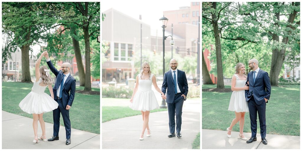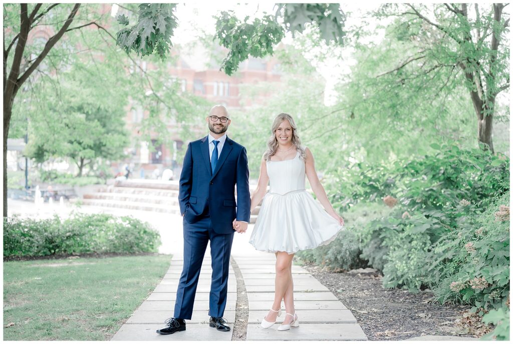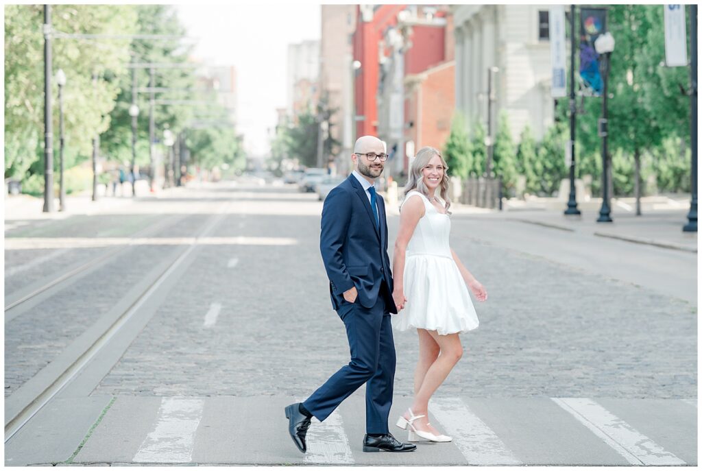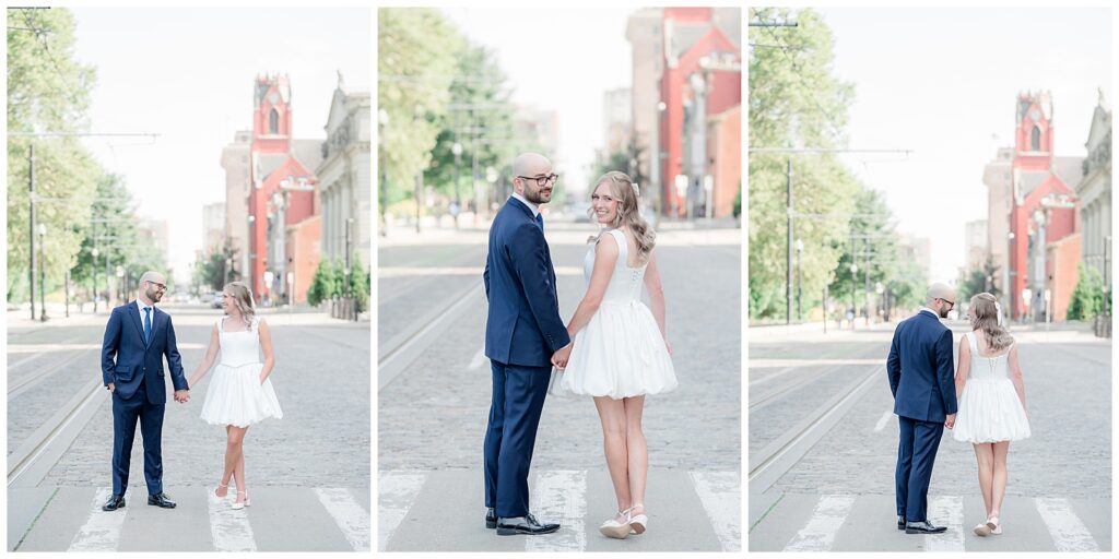 We started the day with bride and groom portraits at Washington Park, just steps from The Transept. This area offers so many portrait opportunities, from greenery to city views, and it’s perfect for couples who want a mix of natural and urban vibes. We also made our way in front of Cincinnati Music Hall, capturing classic shots — including some fun “walking the crosswalk” moments.
