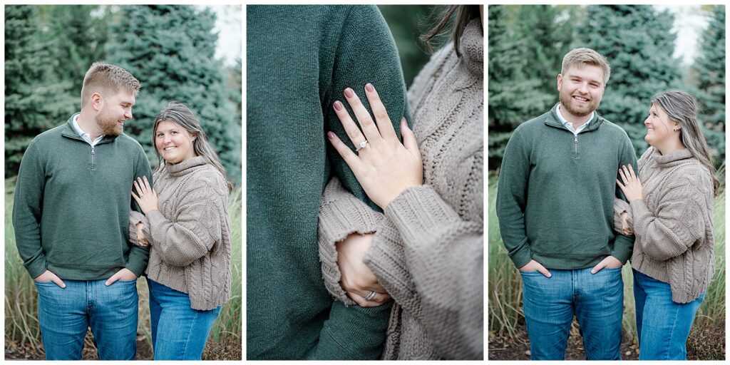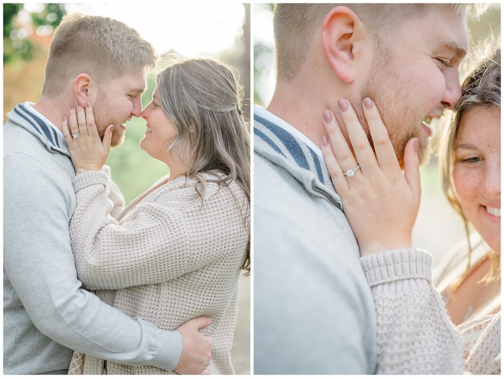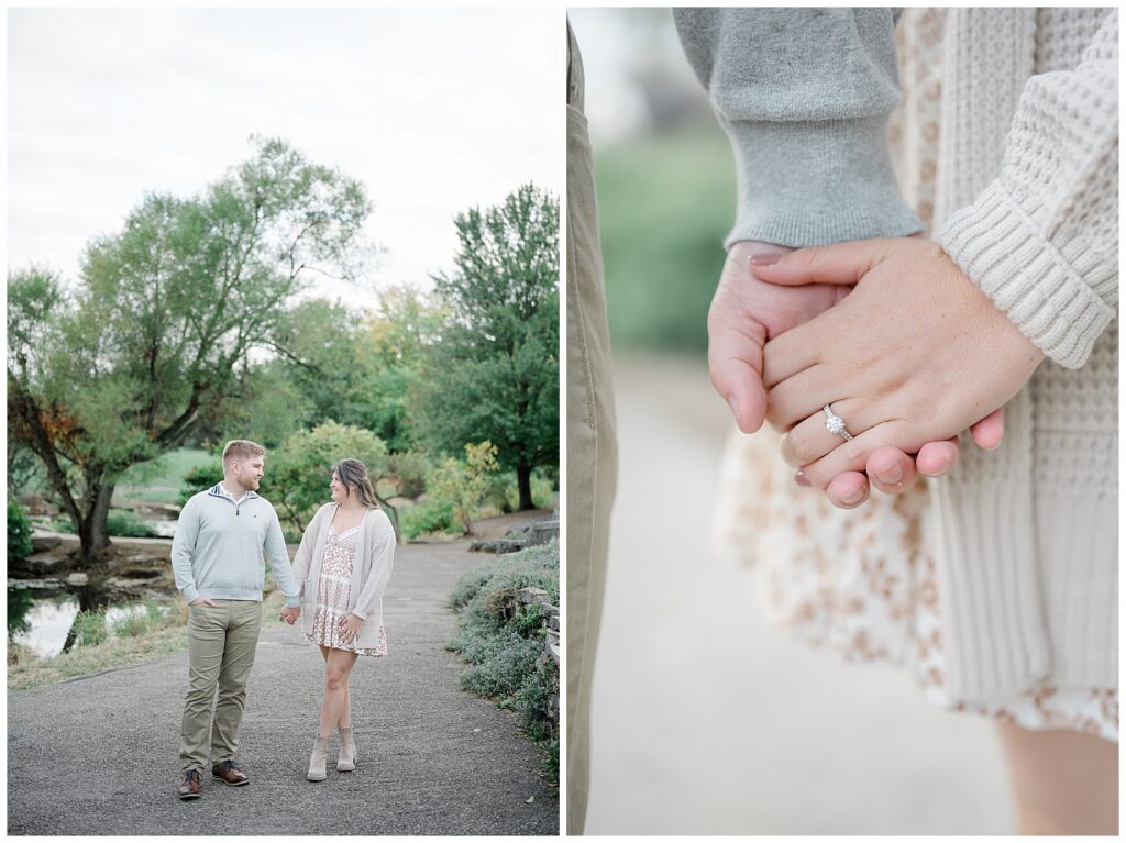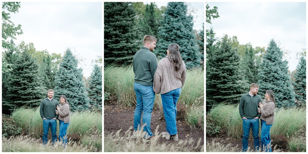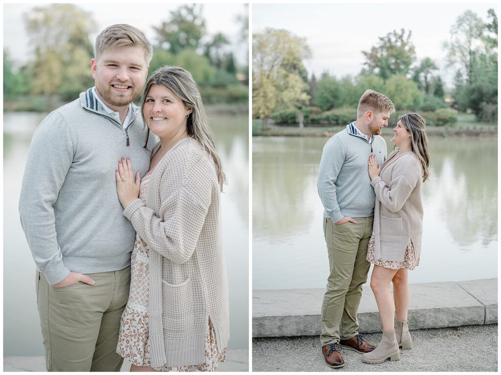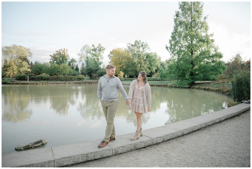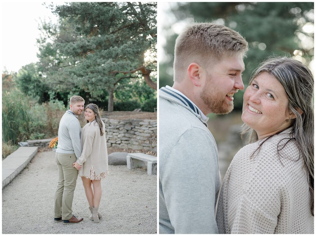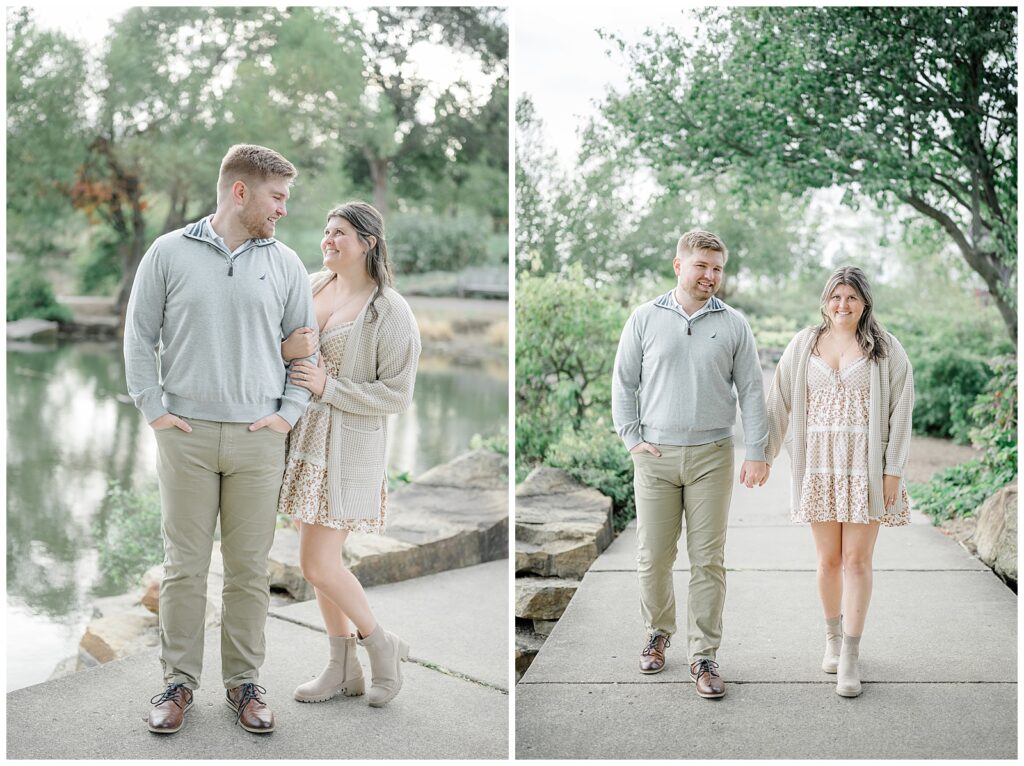 For the second half of their session, we headed to Cox Arboretum just as fall was beginning to show itself. The trees were starting to turn, adding subtle pops of warm color that made the setting feel cozy and romantic. Owen wore soft grays and creams, while Mary’s dress paired with a cream sweater created the perfect fall palette. These neutral tones photograph beautifully and never overpower the scenery.