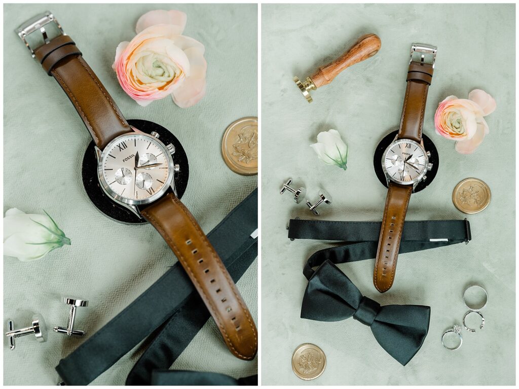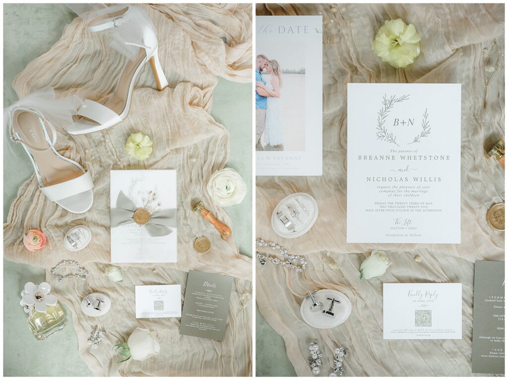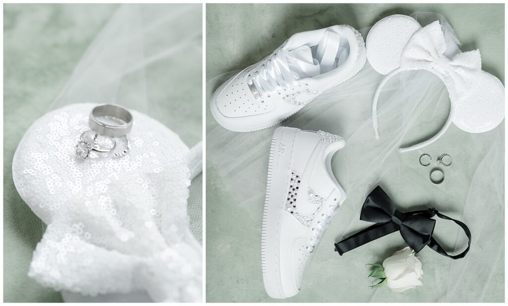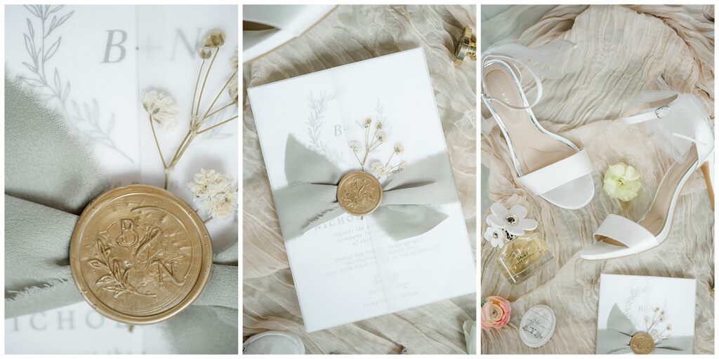 We started the day with flatlay details, and Bre was an absolute dream. She had everything perfectly organized in a box and ready to go, which made capturing her details such a joy. Her stationery suite was stunning — wrapped in sage ribbon, accented with dainty florals, and finished with a wax seal that tied everything together so beautifully. The loose florals added softness and elegance, and because Bre and Nick were heading to Disney for their honeymoon, they couldn’t resist including bridal Mickey ears. A personal touch that made me smile instantly.