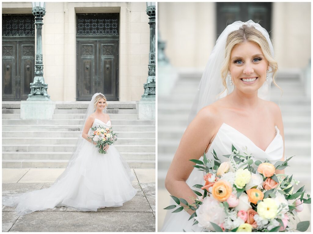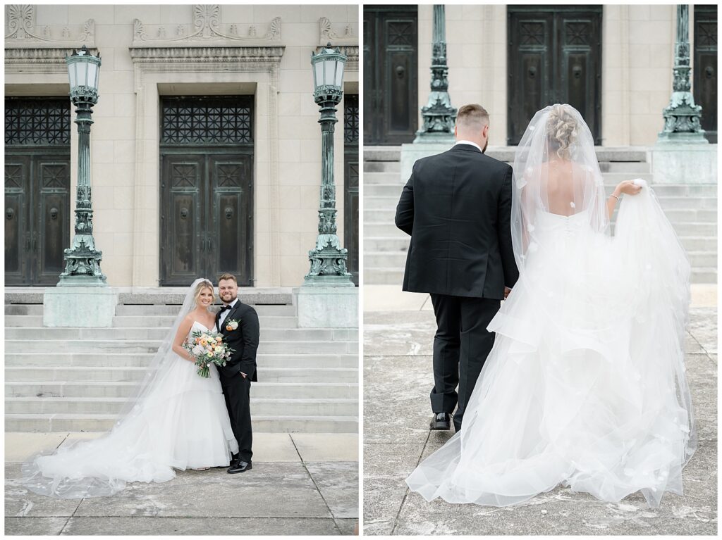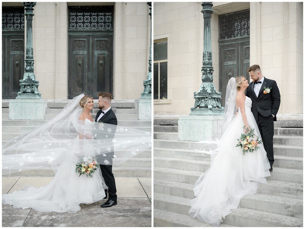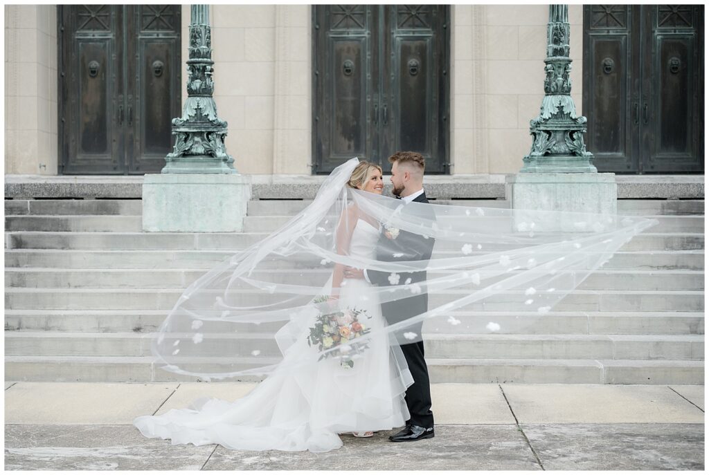 Following the ceremony and family portraits, we made our way to the Dayton Masonic Temple steps for Bre and Nick’s husband-and-wife portraits. The light-colored stone of this building was the perfect backdrop, and this is where Bre wore her veil — which absolutely completed her look. The delicate appliqués were so dainty and romantic, and you know we captured some veil shots. These portraits were timeless, elegant, and full of joy.