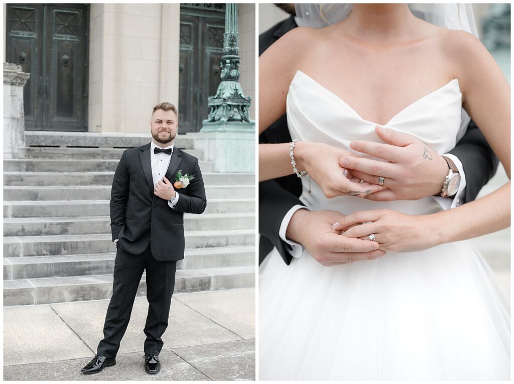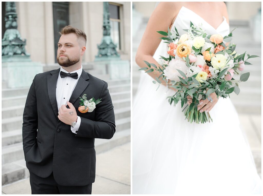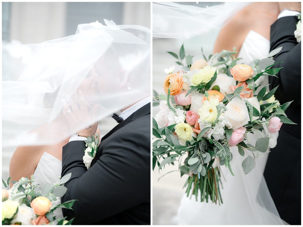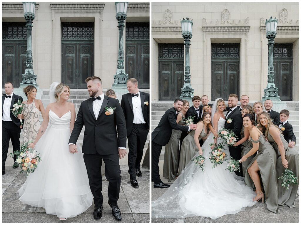 Following the ceremony and family portraits, we made our way to the Dayton Masonic Temple steps for Bre and Nick’s husband-and-wife portraits. The light-colored stone of this building was the perfect backdrop, and this is where Bre wore her veil — which absolutely completed her look. The delicate appliqués were so dainty and romantic, and you know we captured some veil shots. These portraits were timeless, elegant, and full of joy.